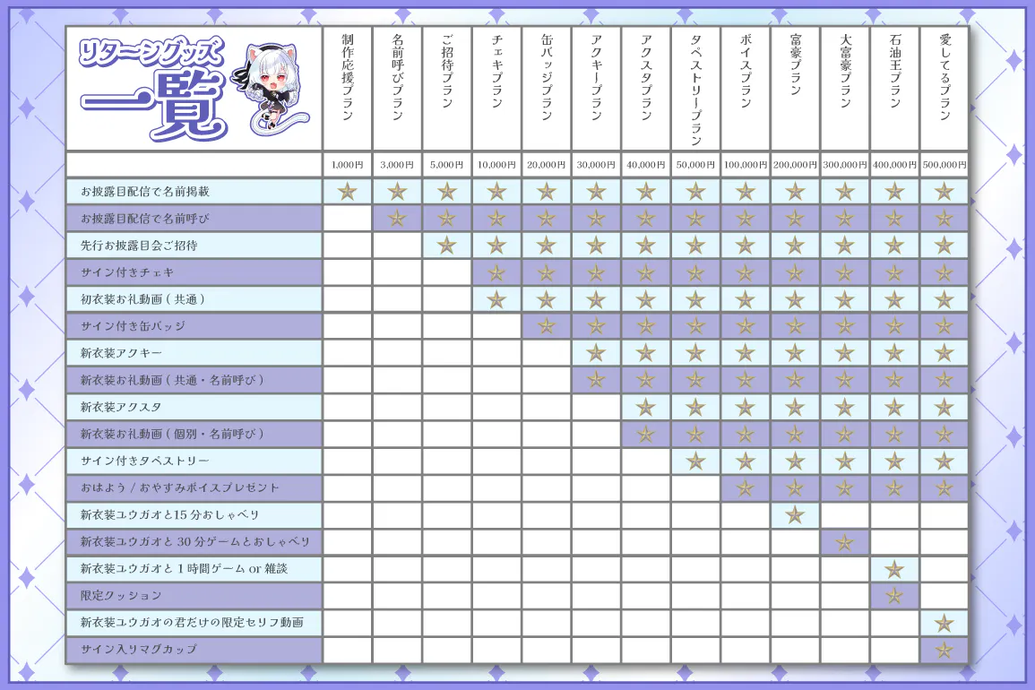 2026/01/29 22:31クラウドファンディングご支援ありがとうございました!リターン品の全てが送信・発送が完了しました。そして2025/12/31にユウガオから名前を改めて【星羽ゆう】となりました。1年で700人overの登録者が増え、あと少しで収益化となります。たくさん見て、たくさん話して、一緒に楽しんでいこうね。これからも応援よろしくお願いします。 もっと見る