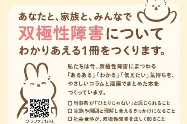 このプロジェクトでは、双極性障害に関する「双極性障害って何?」「双極性障害のあるある漫画」「コラム」でまとめた書籍を出版したいと考えています。