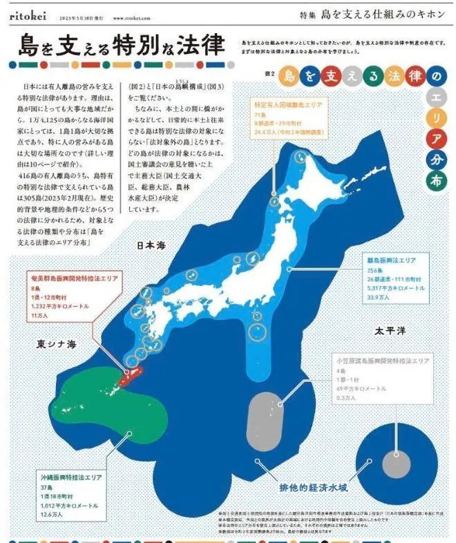『季刊ritokei』より。北海道・本州・四国・九州・沖縄本島以外の人が暮らす島が「日本の有人離島」と呼ばれ、100万人弱が居住。世界6位の広さを誇る「排他的経済水域(EEZ)」は、島々が存在しなければ半分に減ってしまうといわれています