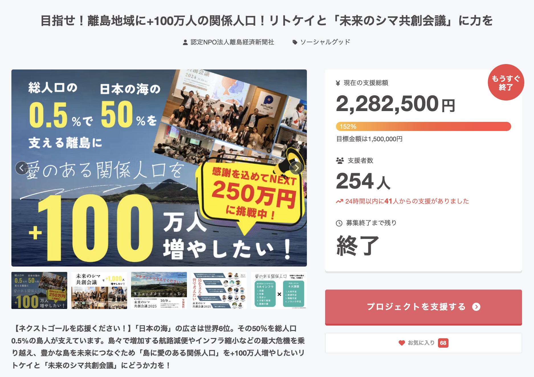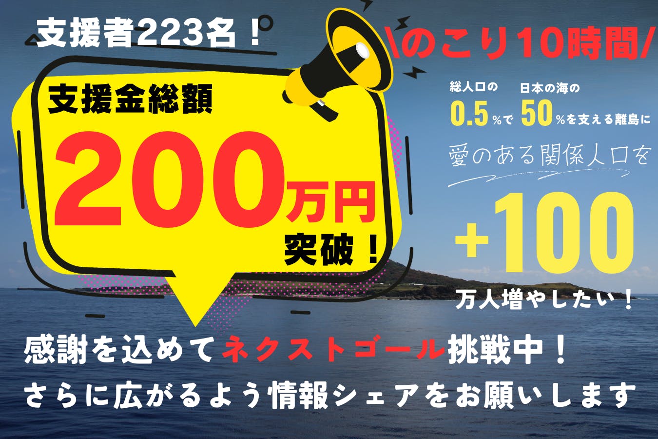 2025/08/31 13:46現在の支援額が200万円を超えました!ネクストゴールの目標達成まであと50万円です。この数日間、本当に多くの方に支援、そして応援の声をいただいています。本当にありが島ございます!!クラファンのリターンにもありますが、来週9/5(金)は大阪、9/19(金)は東京でリトケイ代表・鯨本あつこがママとなり、リトケイメンバーや島に興味関心のある仲間と共に、島を肴に語り合える「スナックくじら」(食べ飲み放題付き)を開催します。クラファン目標達成の祝杯を上げたいと思いますので、ご都合あう方はぜひご参加くださいませ。ご支援いただいた資金は、イベント運営費の一部として大切に活用させていただきます。リトケイと「未来のシマ共創会議」無料開催に、ぜひ力をお貸しください。このプロジェクトもいよいよ残り10時間。最後までご支援、どうぞよろしくお願い島す!!<ご留意ください>本プロジェクトは社会貢献プロジェクトを対象とした「CAMPFIRE for Social Good」にて実施しています。リターン金額をまるごとプロジェクトの応援に活用させていただくかわりに、支援者さまにはリターン+ご協力費(12%+税)のご負担がございます。「愛のある関係人口プラス100万人」を叶えていけるようメンバー一同がんばってまいりますので、どうかご理解のうえご支援くださいますようお願いいたします。 もっと見る