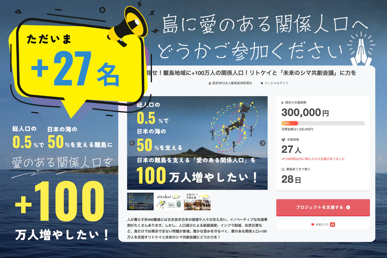 『目指せ!離島地域に+100万人の関係人口!リトケイと「未来のシマ共創会議」に力を』は、「100万人」の第一歩として、まずは10/9「未来のシマ共創会議2025」にオンライン・リアルで1,000人ご参加を目指しています。