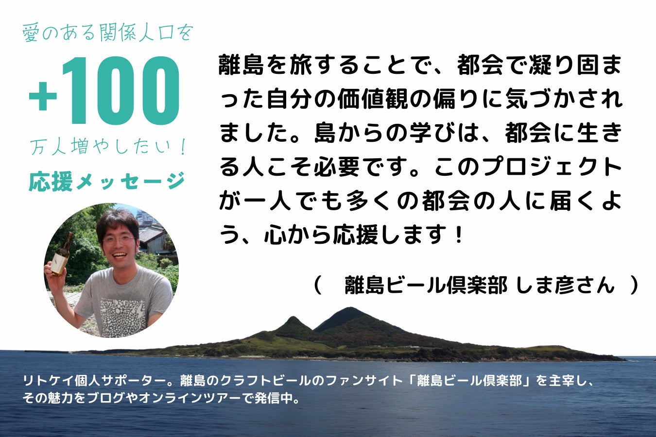 全国の島でつくられるクラフトビールの情報を集めるウェブサイト『離島びーる倶楽部』を立ち上げ、情報発信やオンラインツアーの企画を行なっている、離島ビール倶楽部 ・しま彦さん より、応援コメントをいただきました!