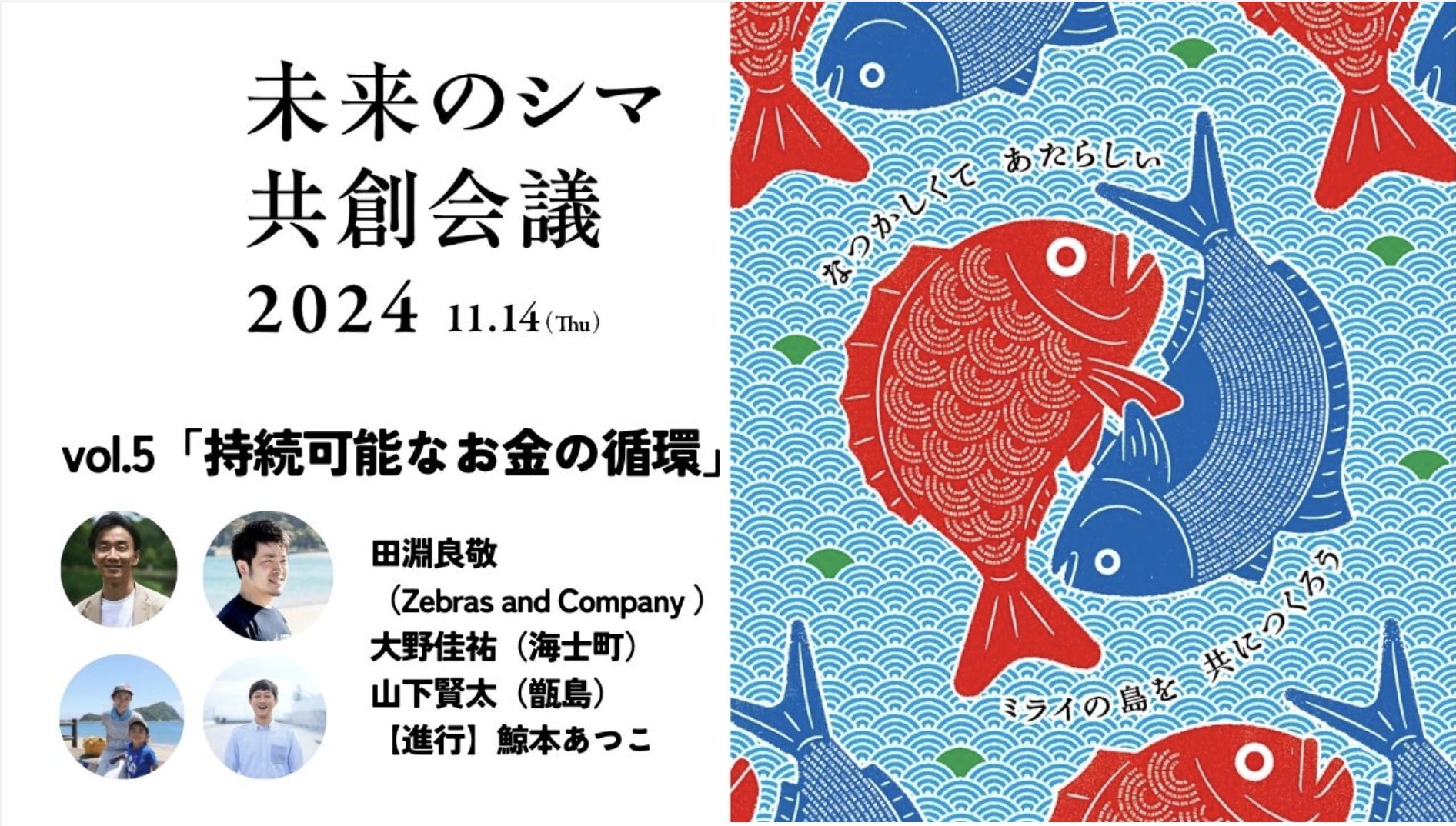 地域づくりのトップランナーとして知られる海士町で先進的なチャレンジを行う大野佳祐さんと、鹿児島・甑島列島の山下賢太さん、社会性と経済性の両立を追求する「ゼブラアンドカンパニー」共同創業者の田淵良敬さん、離島経済新聞社代表理事の鯨本あつこが「持続可能なお金の循環」について語ります。