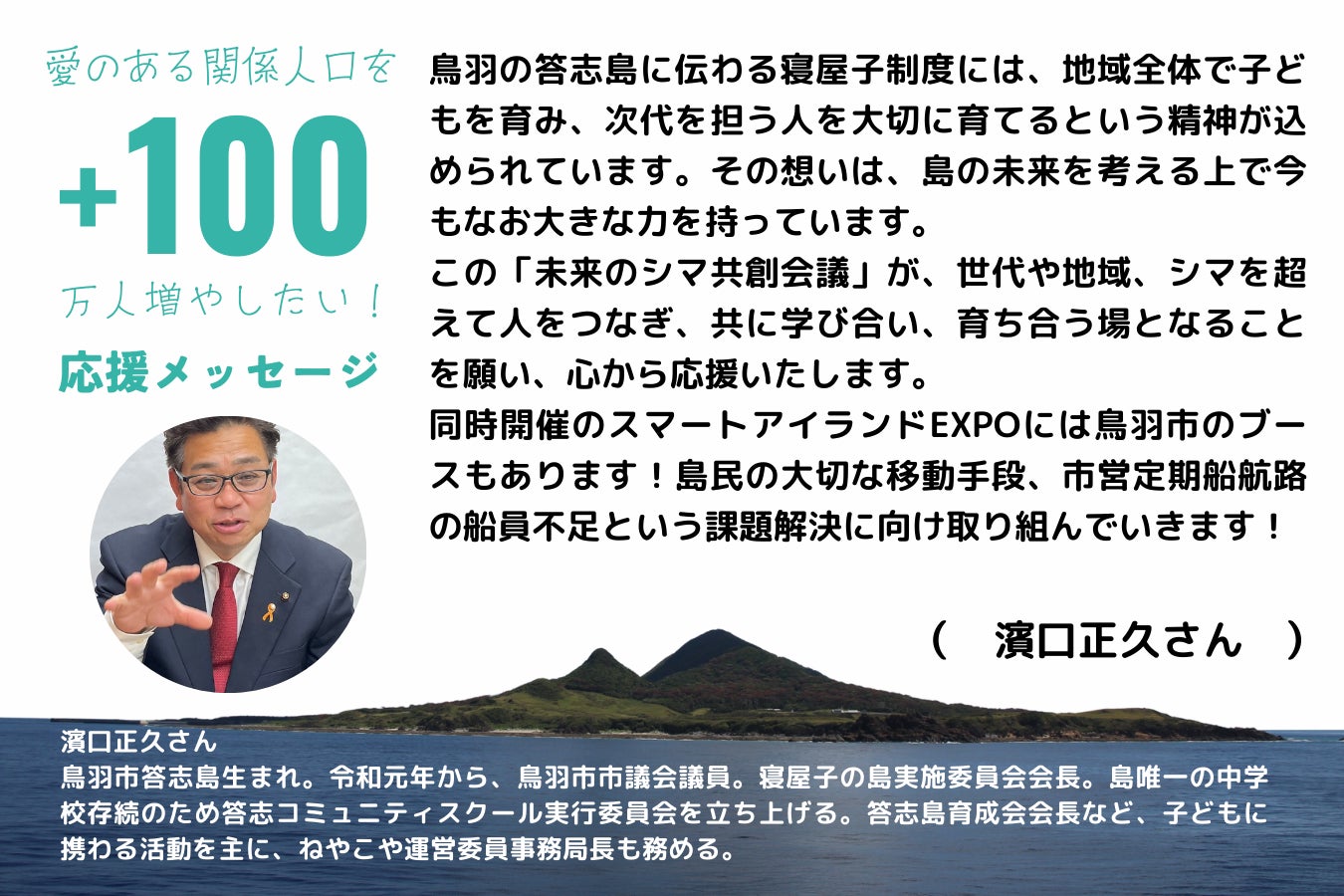 三重県・鳥羽市議会議員をされながら、答志島特有の「寝屋子制度」などの島づくりに取り組む濱口正久さんより、応援メッセージをいただきました!