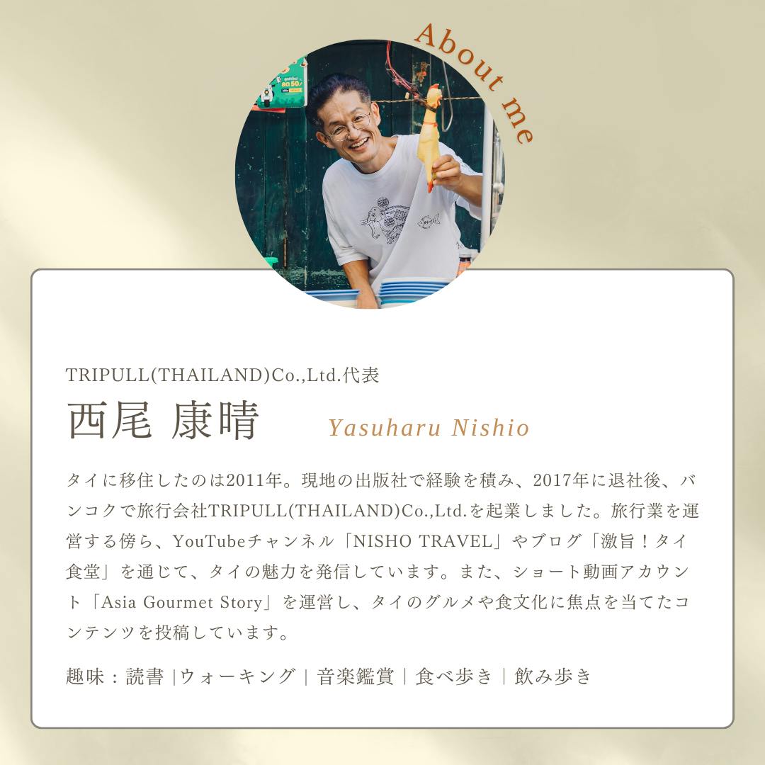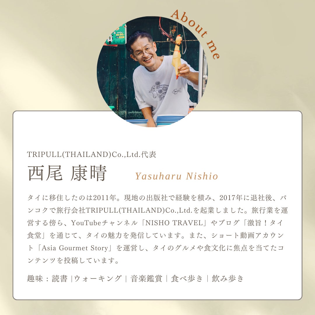 私はタイ・バンコクで「TRIPULL(トリプル)」という旅行会社を運営しながら、タイ国内の旅やグルメ、文化を日本の皆さんに紹介するYouTubeチャンネルも運営しています。