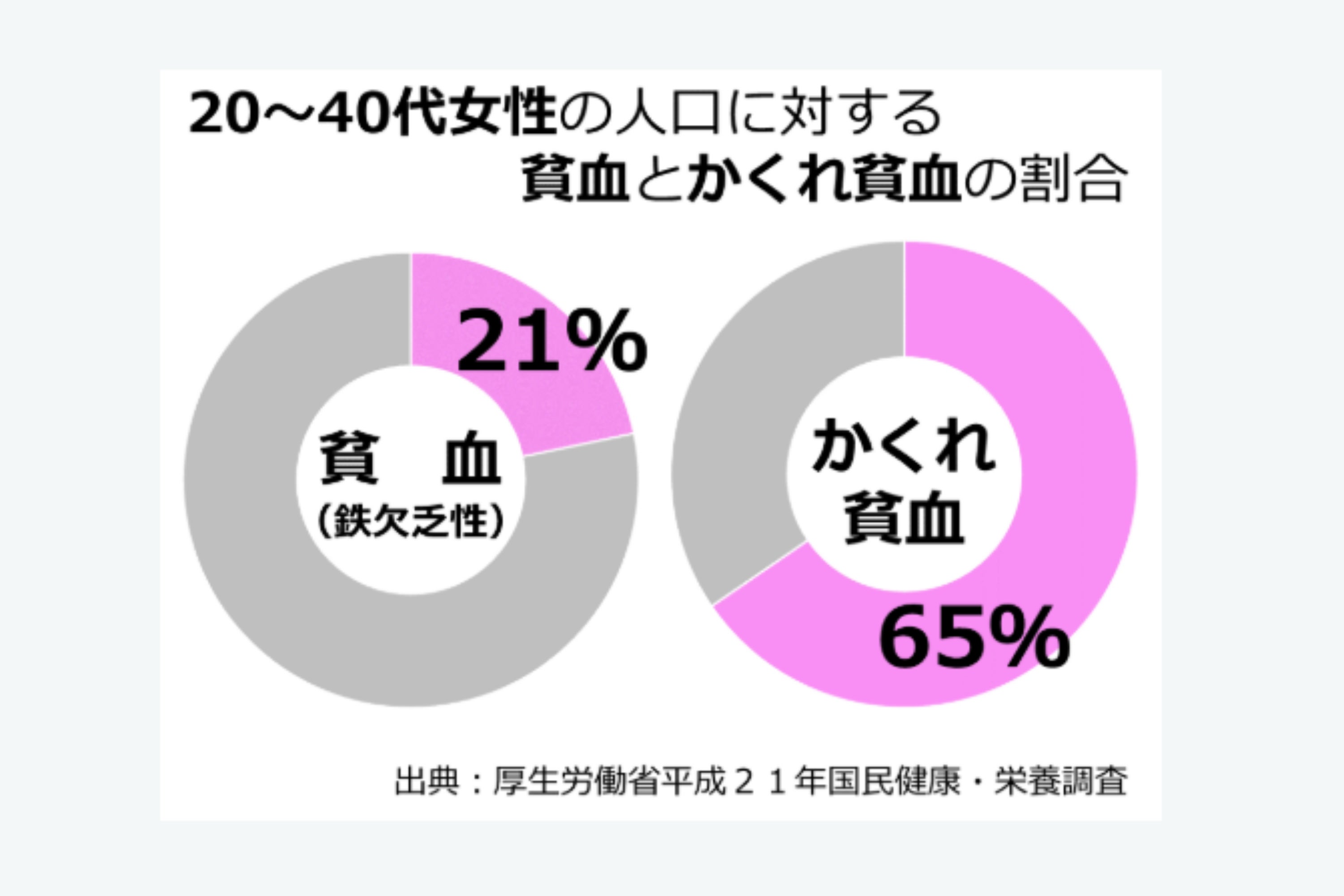 厚生労働省の調査によると、20〜30代女性の約8割が生理前後に心身の不調を感じているとされ、隠れ貧血の可能性がある女性は全体の65%にものぼると報告されています。
