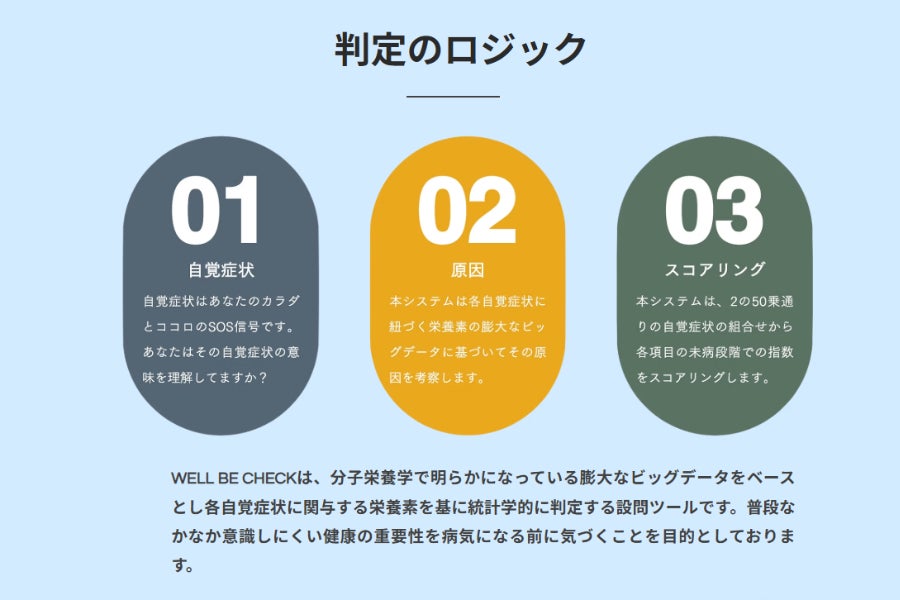 未病を数値化できるツールである「WELL BE CHECK」。LINEで50問の質問に「はい/いいえ」でお答えいただくだけで出た結果をより詳細に紐解き、あなたの現在の心と体の状態を知ることができる 栄養カウンセリングを45分間zoomでご体験いただけます。 結果に解説がついたレポート付き。
