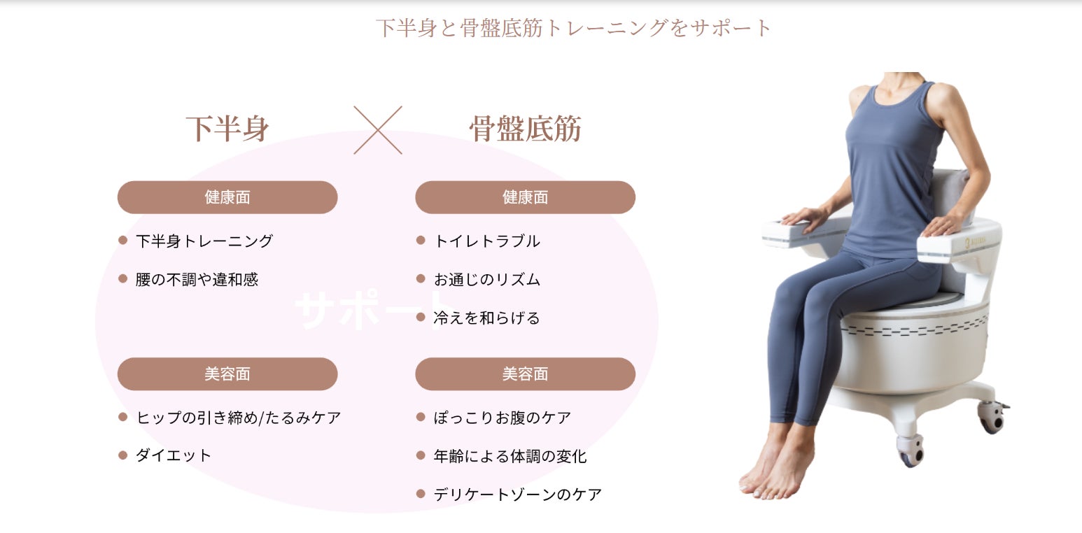 医療機関等でも導入されている最新トレーニングチェア「BIJIRIS」を使い、産後や年齢による骨盤のゆるみや尿もれ・冷え・代謝の低下などに、座るだけで効果的にアプローチ。