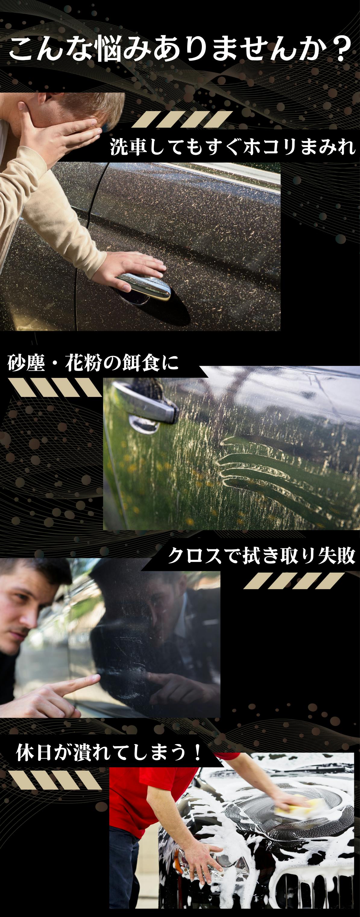 ・雨で凝結してこびりついた車のボディのホコリ、砂埃、花粉、黄砂は取れませんので、洗車にて取り除いてください。