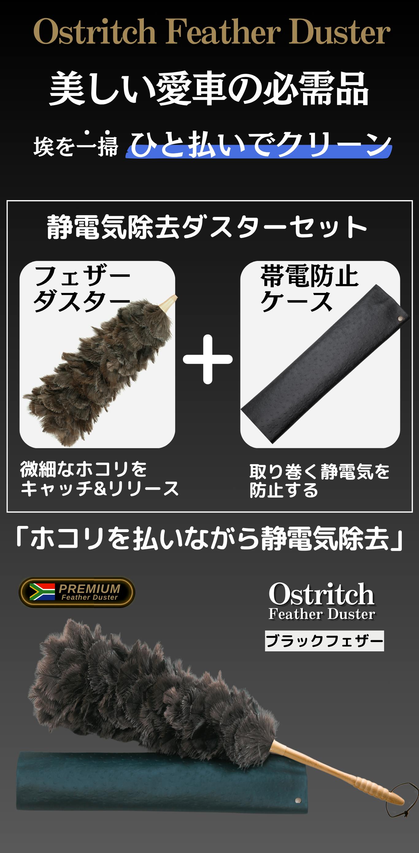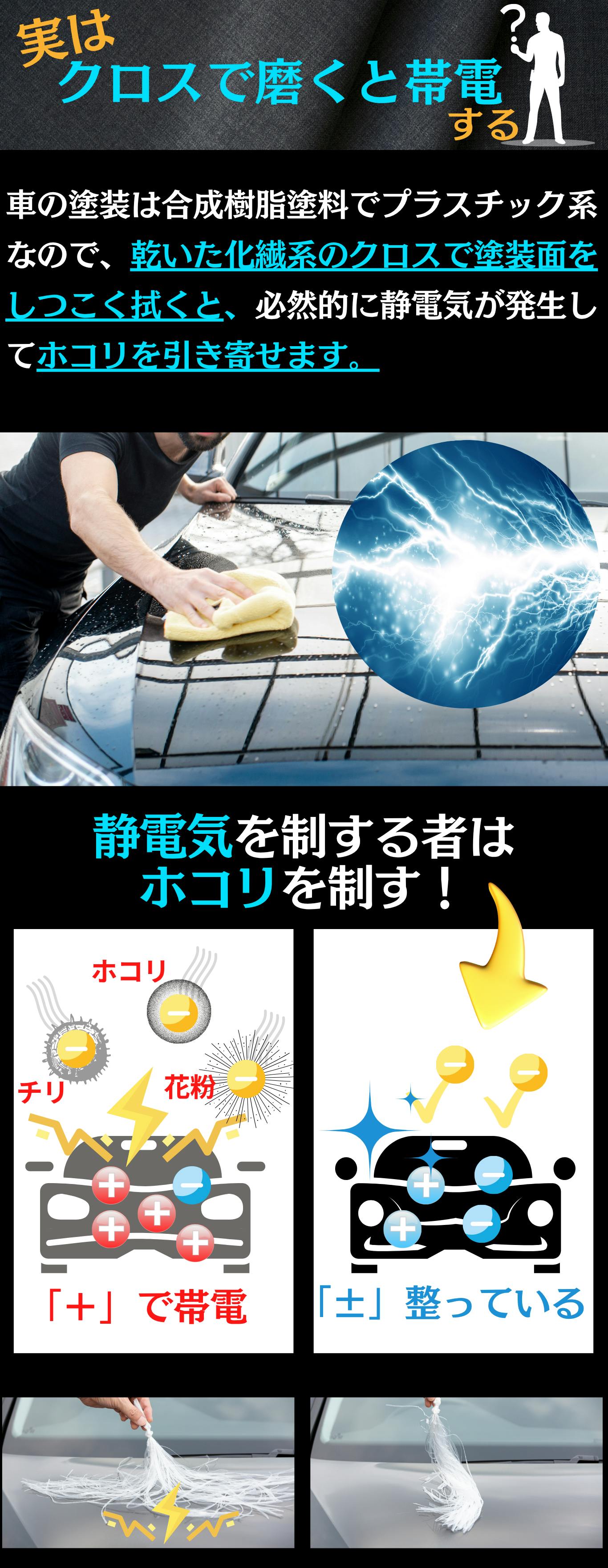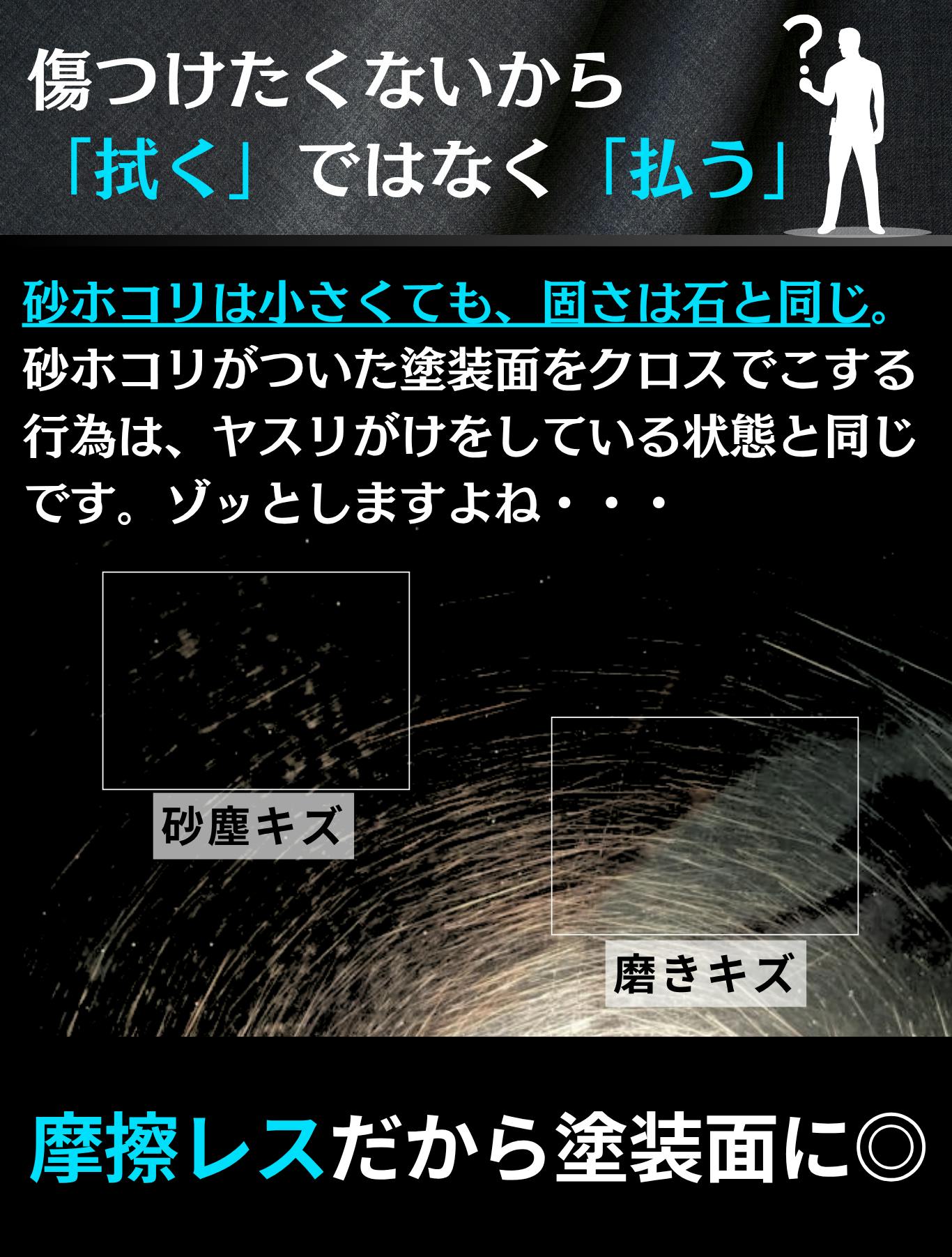 ・本格的なコーティング施工直後のボディは、塗装面が強く擦られた事によって想定以上の静電気が発生してしまい、羽毛が張り付くなどの影響を受ける場合があります。その場合は、静電気が収まるまで、しばらく経ってからご利用ください。