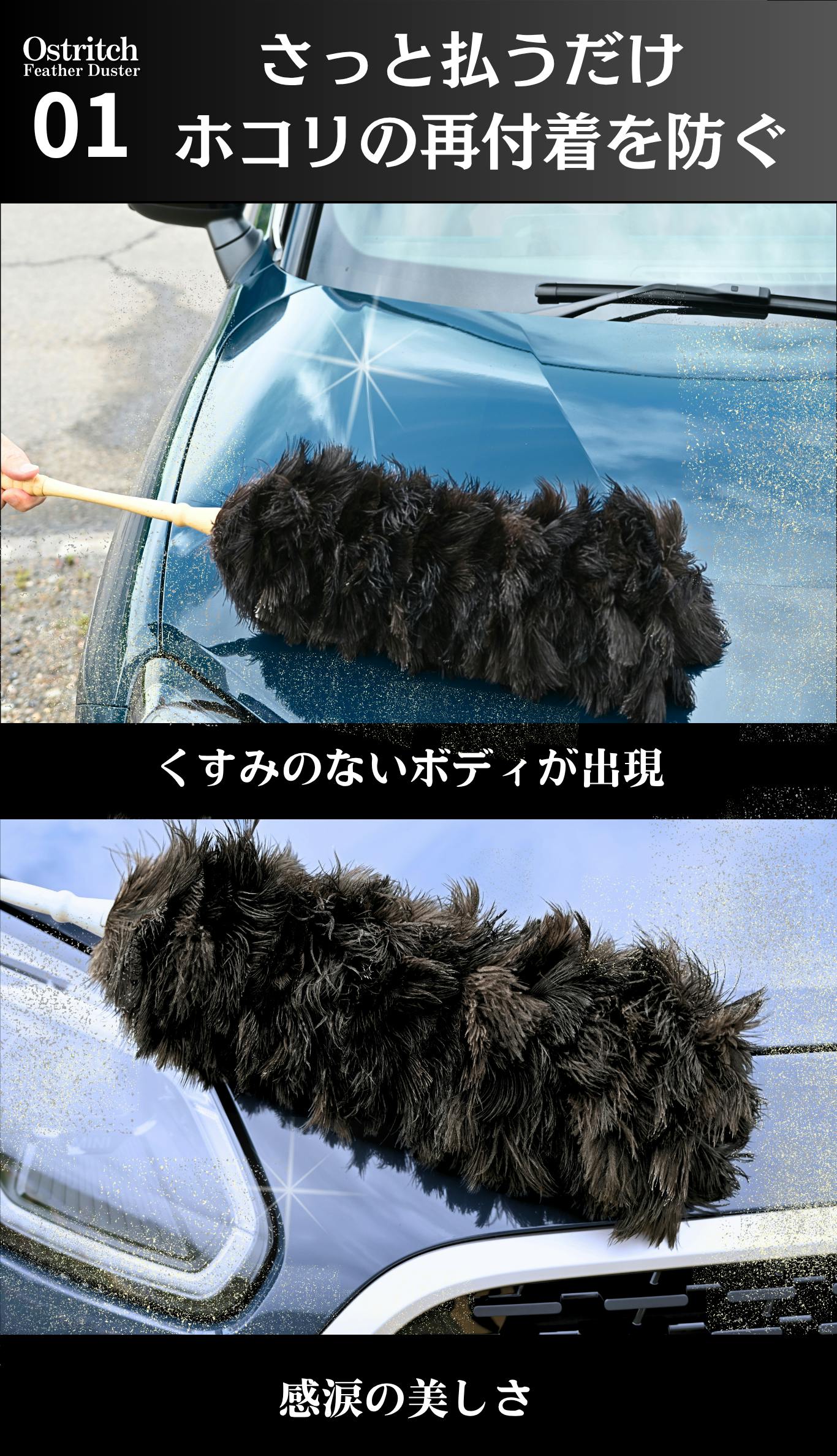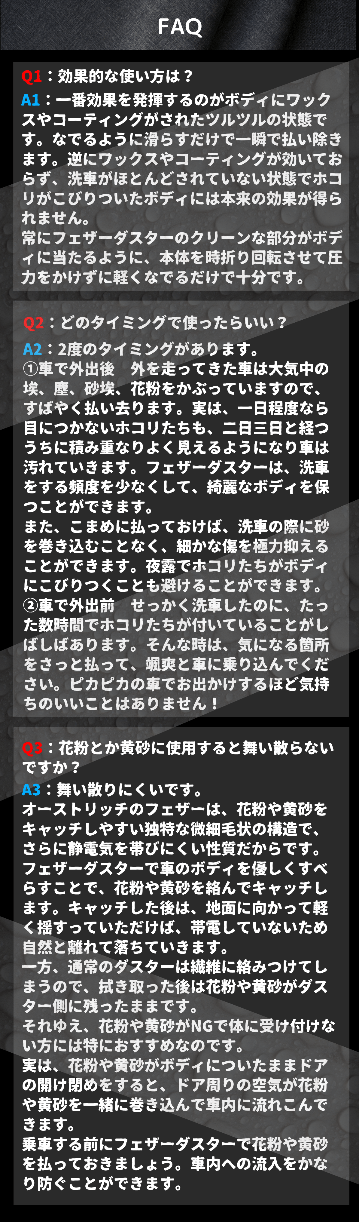 machi-ya公開にて大変お世話になっております。企画担当のTOMOです。私は、洗車グッズの企画をするくらい車好きではあるのですが、洗車をこまめにしているわけではありません。せっかくの休日がもったいないと思ってしまいます…一生懸命に洗車して極艶にして見惚れていたのも束の間。数時間もすればホコリが被っているなんてザラです。次の日にはもうホコリまみれ。花粉や黄砂の時期になると、花粉が苦手な私にとって車に降り積もっている奴らを見るたびに憂鬱な気分にさせられます。ホコリを被った愛車の見た目が悪いだけでなく、ドアを開閉するたびに花粉が舞い上がり室内に侵入してくるのです。その度にくしゃみが連発。もう車に乗るのもいやになります。ところが、このフェザーダスターは、花粉も黄砂も一網打尽に払ってくれるのです。しかも、空中に舞い上がらないので本当にありがたい。その後、フェザーダスターを持ちながら腕を伸ばし切って、ぽんぽんと叩いてやると花粉や黄砂、ホコリが地面に落ちていきます。後始末がすごく簡単です。