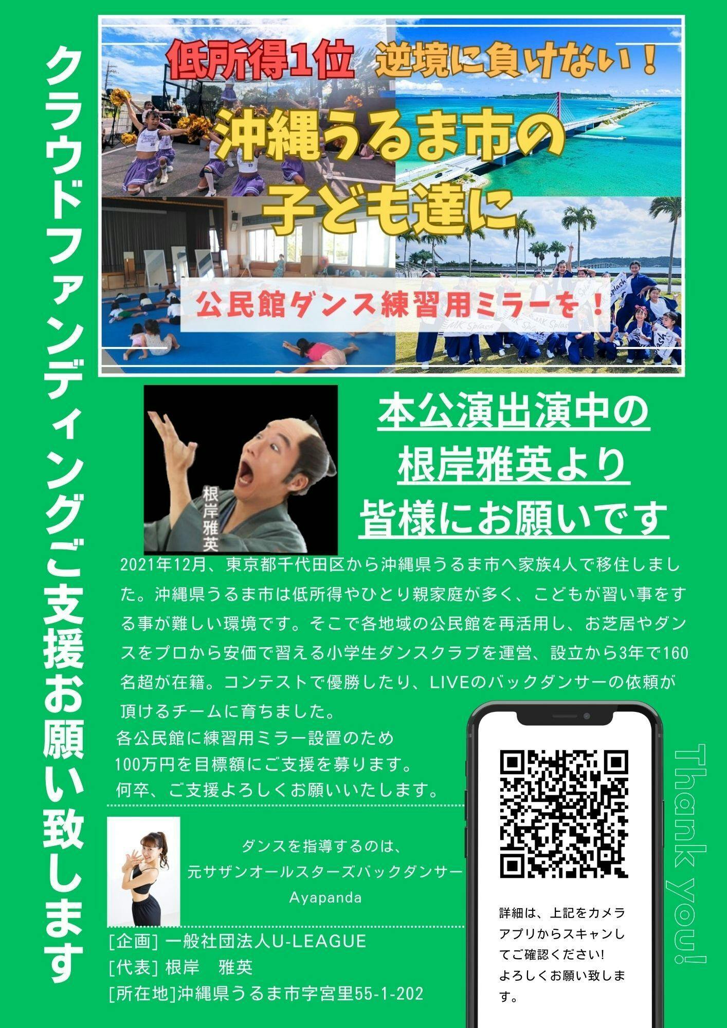 私、根岸雅英が出演しました神田時来組本公演『究極版!そして龍馬は殺された』の全座席に、クラウドファンディング支援のお願いチラシを折り込んで頂きました。