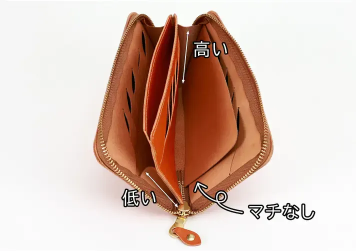 小銭ポケットの口にはファスナーがありませんが、外側のファスナーからの高さの差は、約1cm。