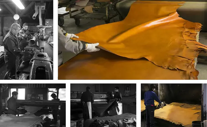 約20のプロセスを経て、「皮」は「革」へと生まれ変わります。植物タンニンで鞣された革は「ヌメ革」とよばれ、コシが強く日光や手の油で色や風合いが経年変化します。