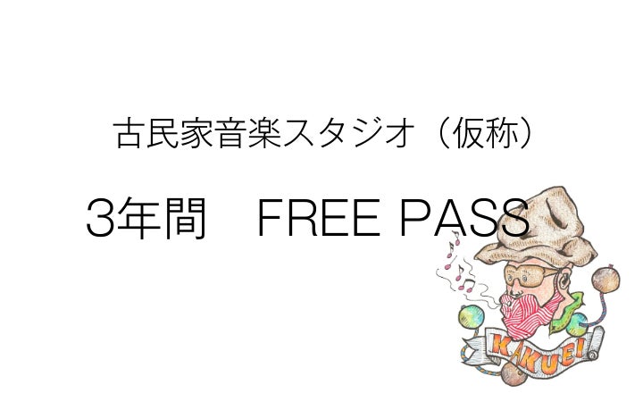 ●古民家音楽スタジオフリーパス3年間有効。(スタジオが軌道に乗ってからの3年間、スタジオのご利用、ライブ全てに関してのFREEPASSになります。ご利用条件としてスタジオ使用は1ヶ月5日間を上限、ライブ観覧は上限無し)