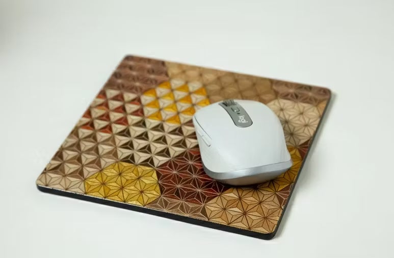 寄木細工の麻の葉亀甲柄のマウスパッドです。麻の葉亀甲柄は魔除けの麻の葉模様と長寿を願った亀甲模様を配した縁起の良い柄となっております。木製品の温かみのある色合いがデスク周りをお洒落に演出します。コンパクトサイズなのでスペースを取ることなく、裏面には滑り止めがついているので使いやすくなっております。マウスパッドだけでなく花台としてもお使いになれます。