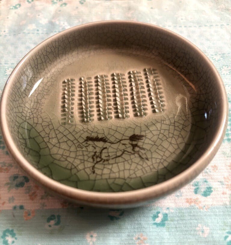 縁起物の左馬が描かれていて一見すると普通の小皿のようですが、しょうがやにんにく、本わさび、ゆずの皮などを少しだけすりおろすのにちょうどよく、食卓で大活躍しています。