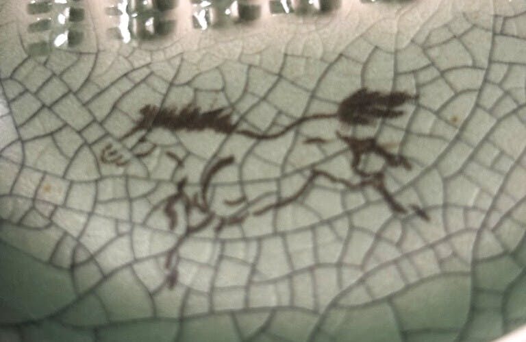 大堀相馬焼は、江戸期(元禄期)に福島県浪江町・大堀で始まり、「青ひび」(青磁釉に生まれる細かな貫入)と、保温性に優れた独自の「二重焼き」、そして縁起物の「左馬(走り駒とも言い、左を向き「右に出るものがない」ことから)」の意匠で知られ、地元の土が原料であることや地域の生活文化に根差した実用性から生まれた技法で、他に例を見ないとされます。