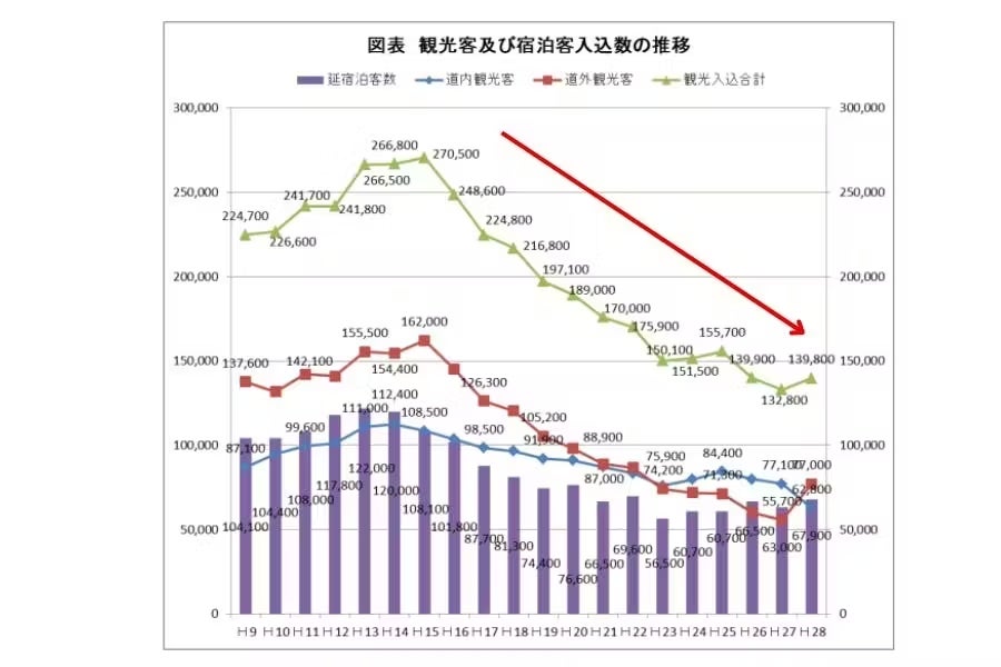 近年、北海道はインバウンド需要の高まりにより、同じ北海道でもニセコや登別といった観光地には多くの外国人観光客が訪れています。しかし、利尻島の観光客数は年間約20万人で、2024年現在でも年々減少傾向にあり、インバウンドによる集客はまだ大きく伸びていない状況です。