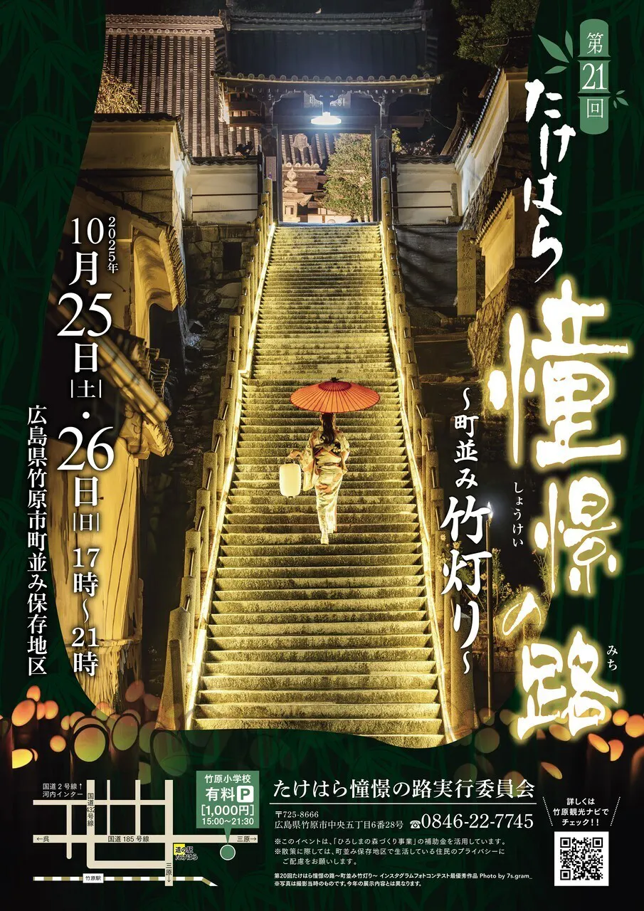 秋の夜を彩る第21回たけはら憧憬の路が近づいてきました。今年も多くの方が来訪して頂けると楽しみにしています。特に今年は、クラファンリターンの竹灯りを駅前商店街の火災跡地に飾りますので、多くの方に来ていただけると嬉しいなぁと思っています。そしてその場所で25日夜、「たまゆら~」と「たけはら~」が懇親できる場面が出来たらいいなぁとも思っています。尚、竹灯りの申込みは9月30日迄となっていますので、お早めにお申し込みをお願いします。