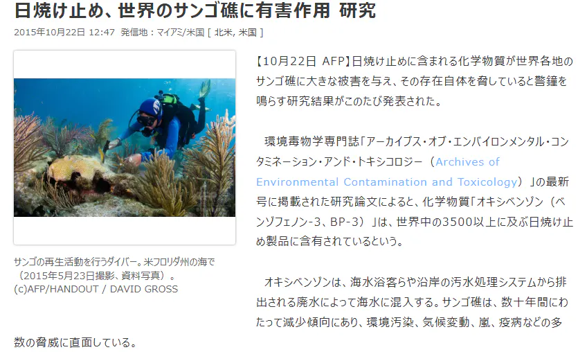 参照元:日焼け止め、世界のサンゴ礁に有害作用 研究(https://www.afpbb.com/articles/-/3063875)