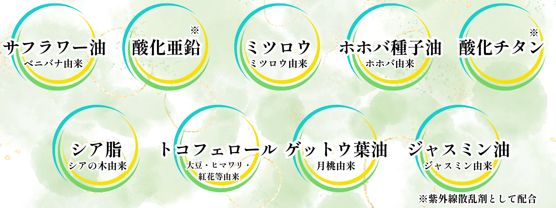 サフラワー油(ベニバナ由来) / 酸化亜鉛 / ミツロウ / ホホバ種子油 / 酸化チタン / シア脂 / トコフェロール(大豆、ヒマワリ、紅花等由来) / ゲットウ葉油 / ジャスミン油