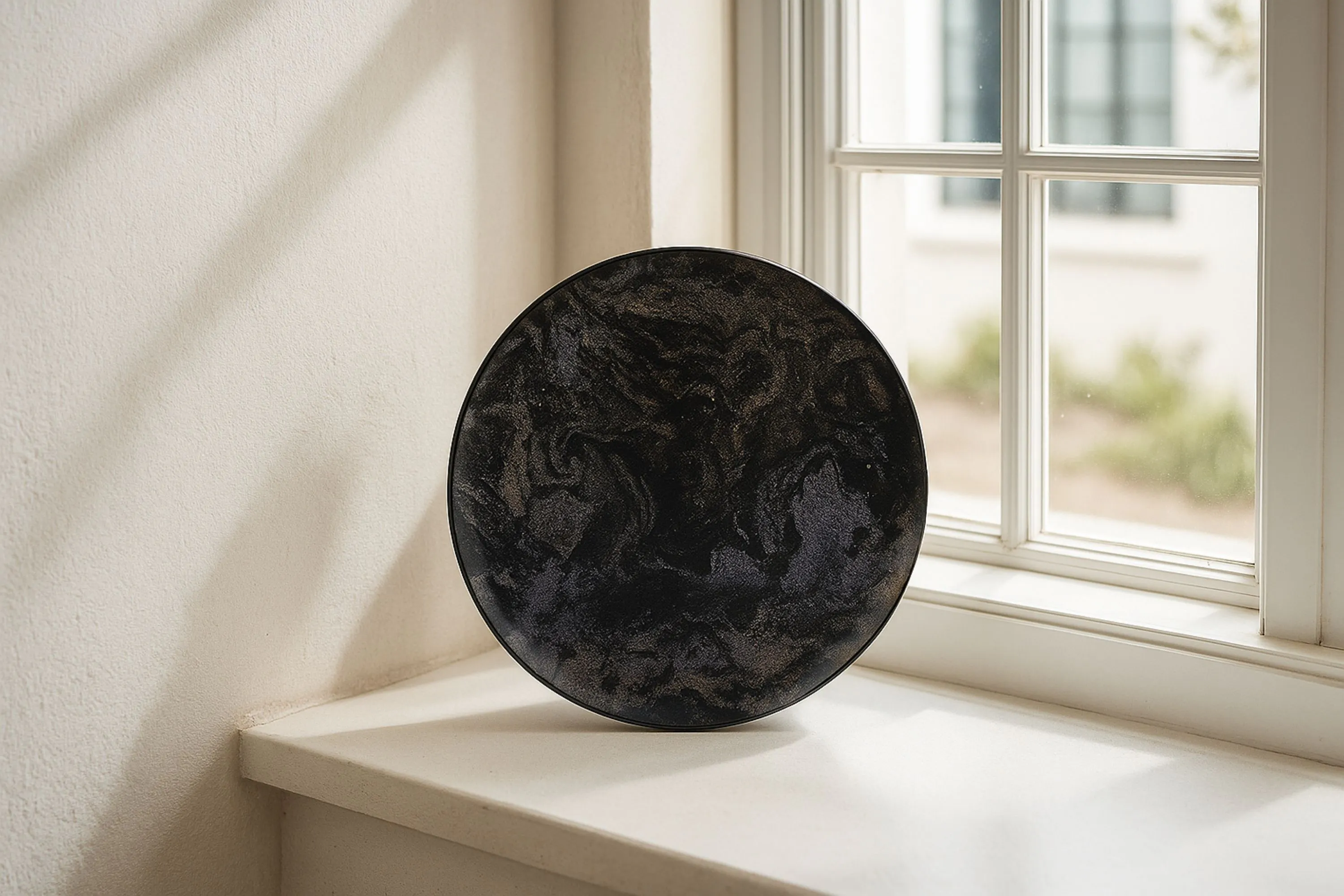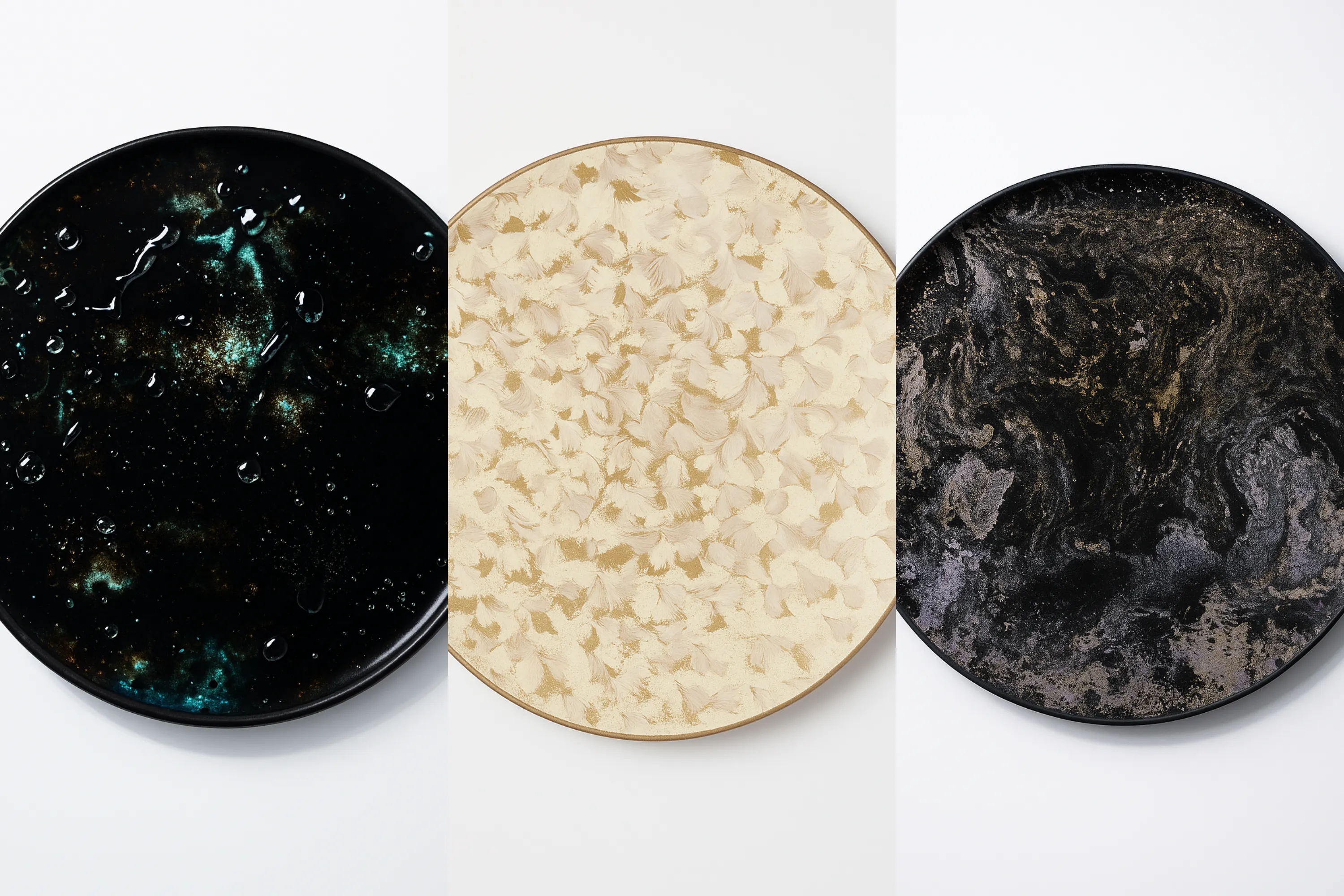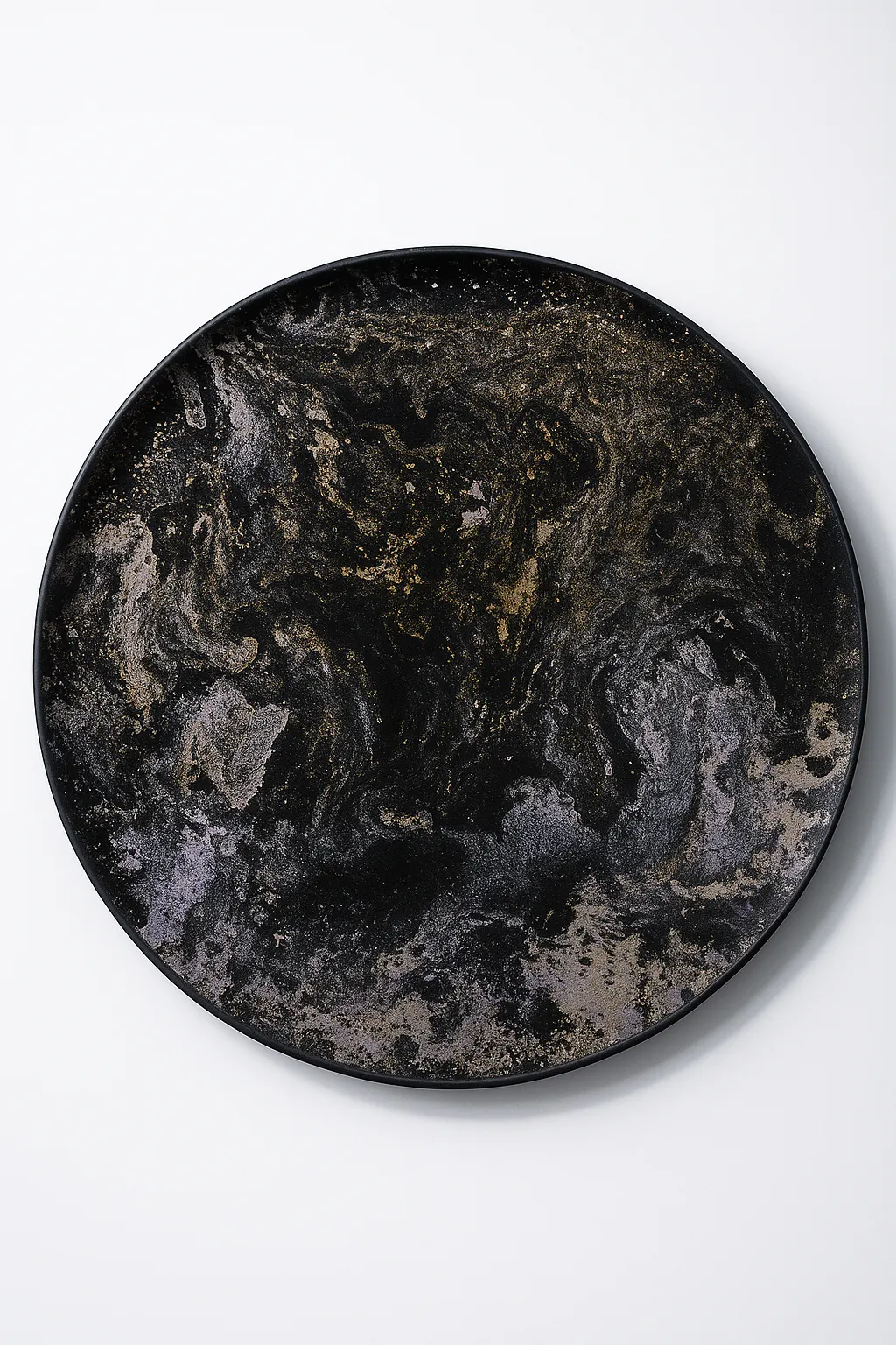 黒の中を流れるように、金と銀が躍動するマーブル模様。静かに燃えるような存在感があり、まるで宇宙や深海を覗き込むような印象を与えます。