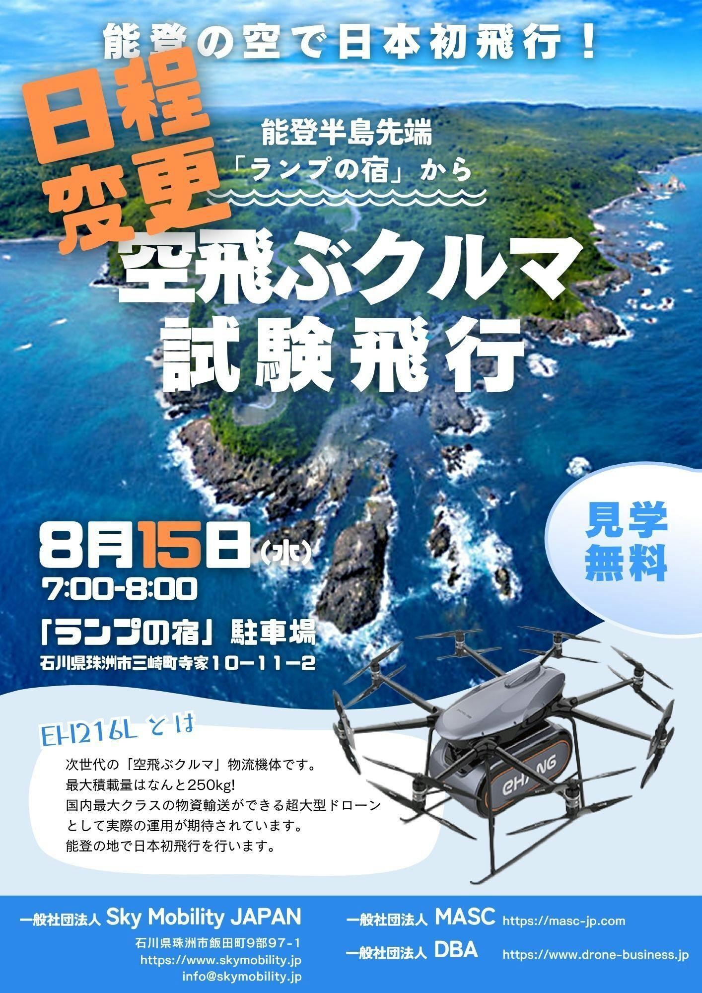 2025年8月13日、能登半島の最先端「ランプの宿」から、EHang社製のeVTOL「EH216L」の日本初フライト試験を実施します。