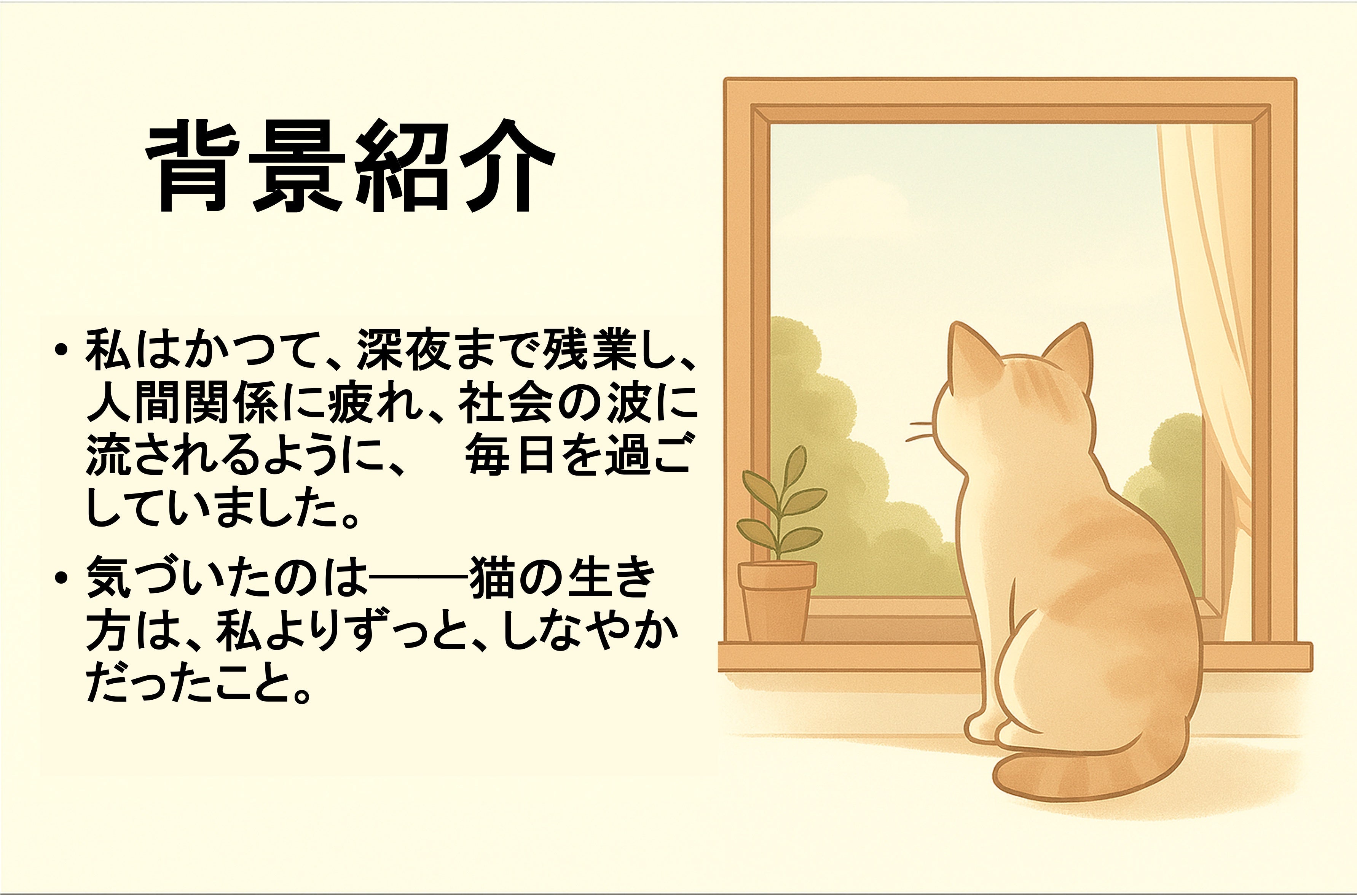 そんな時、窓辺で丸くなって眠る一匹の猫の姿が、なぜかとても豊かに見えました。