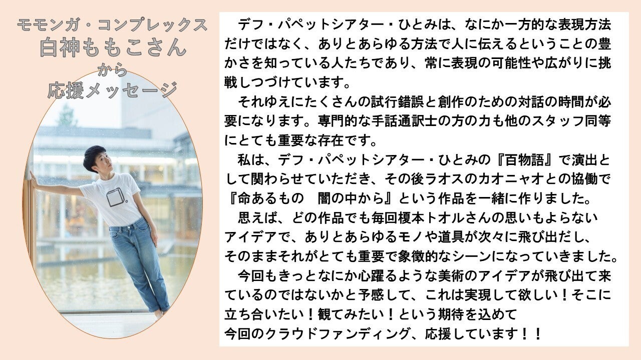 "デフ・パペットシアター・ひとみは、なにか一方的な表現方法だけではなく、ありとあらゆる方法で人に伝えるということの豊かさを知っている人たちであり、常に表現の可能性や広がりに挑戦しつづけています。