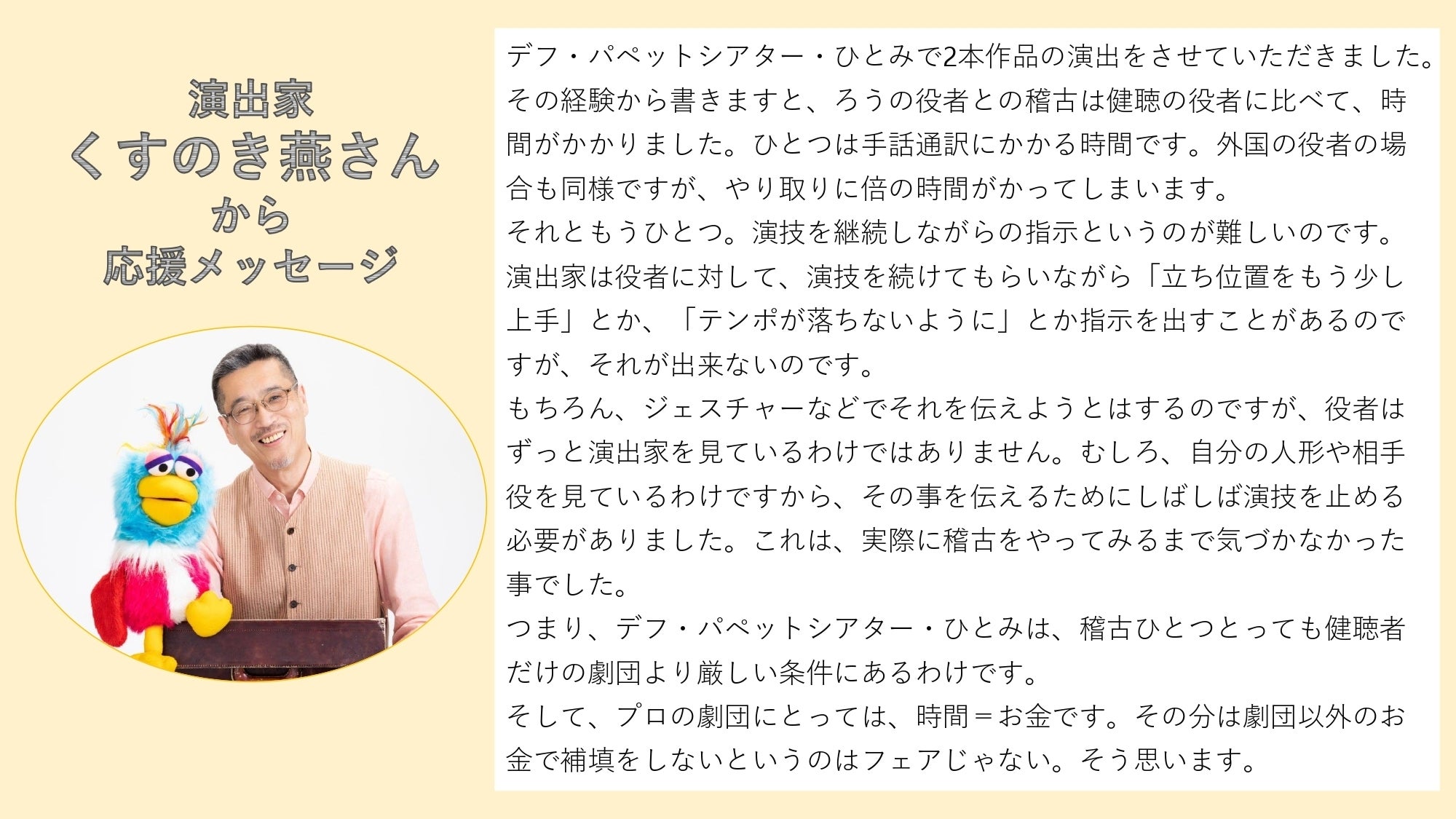 長い期間、本クラウドファンディングを見守って下さり、応援いただき、本当にありがとうございます!ついに今週末で終了を迎えます。ずっと前からデフパペットを応援いただいていた方、今回初めてデフパペットを知っていただいた方、沢山の方の応援を日々受け取り、感謝の気持ちでいっぱいです。稽古場では、人形の造形が少しずつ完成に近づいています。本作品の人形は、実は「折り紙」をモチーフにしています。一体ずつ、こだわりながら手作業で折り紙風のデザインが施されています。これからさらに、細かく人形の表情がついてきます。来週は舞台美術も含め、美術がダイナミックに仕上がっていく予定です。達成まで、引き続き応援のほど、よろしくお願いします!