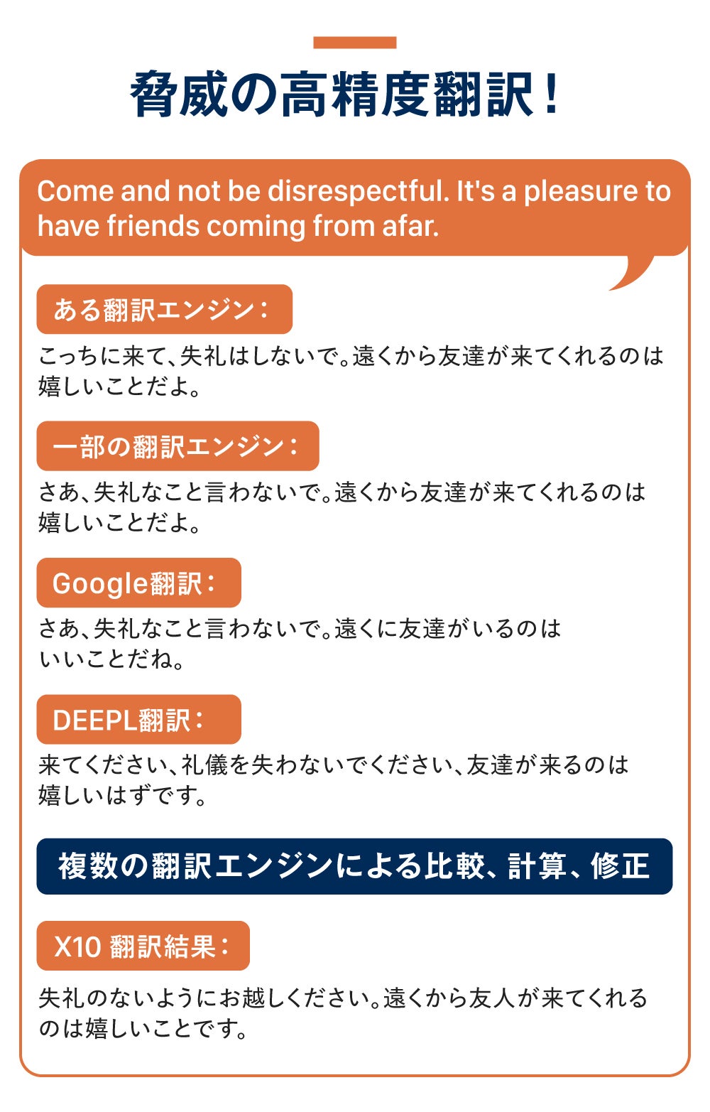 X10独自のAI翻訳エンジンで翻訳するため、より精度の高い翻訳が可能。