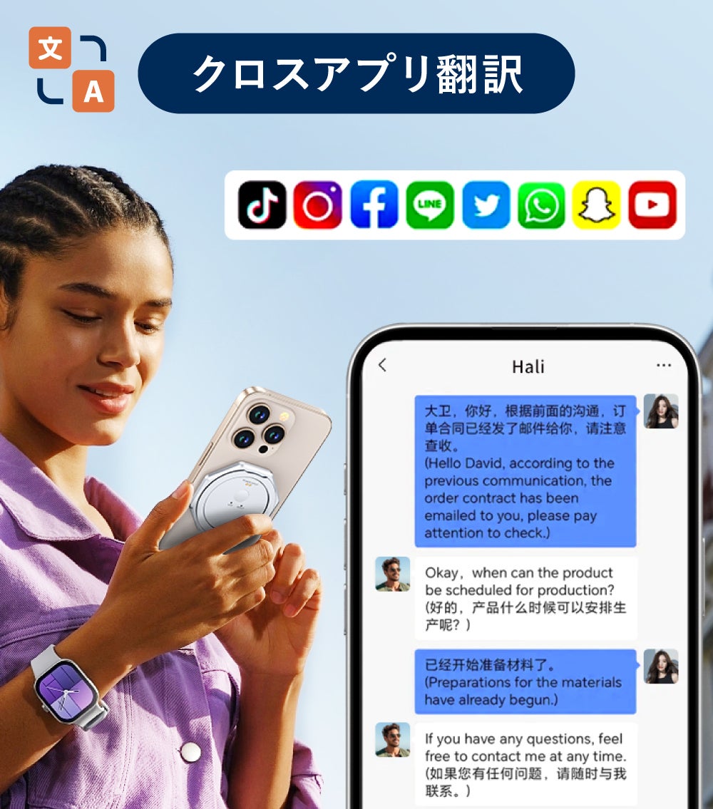 クロスアプリ翻訳モードを使うことで、あなたが母国語で話すたびにSNSチャットの吹き出しに、翻訳されたテキストがダイレクトに入力。