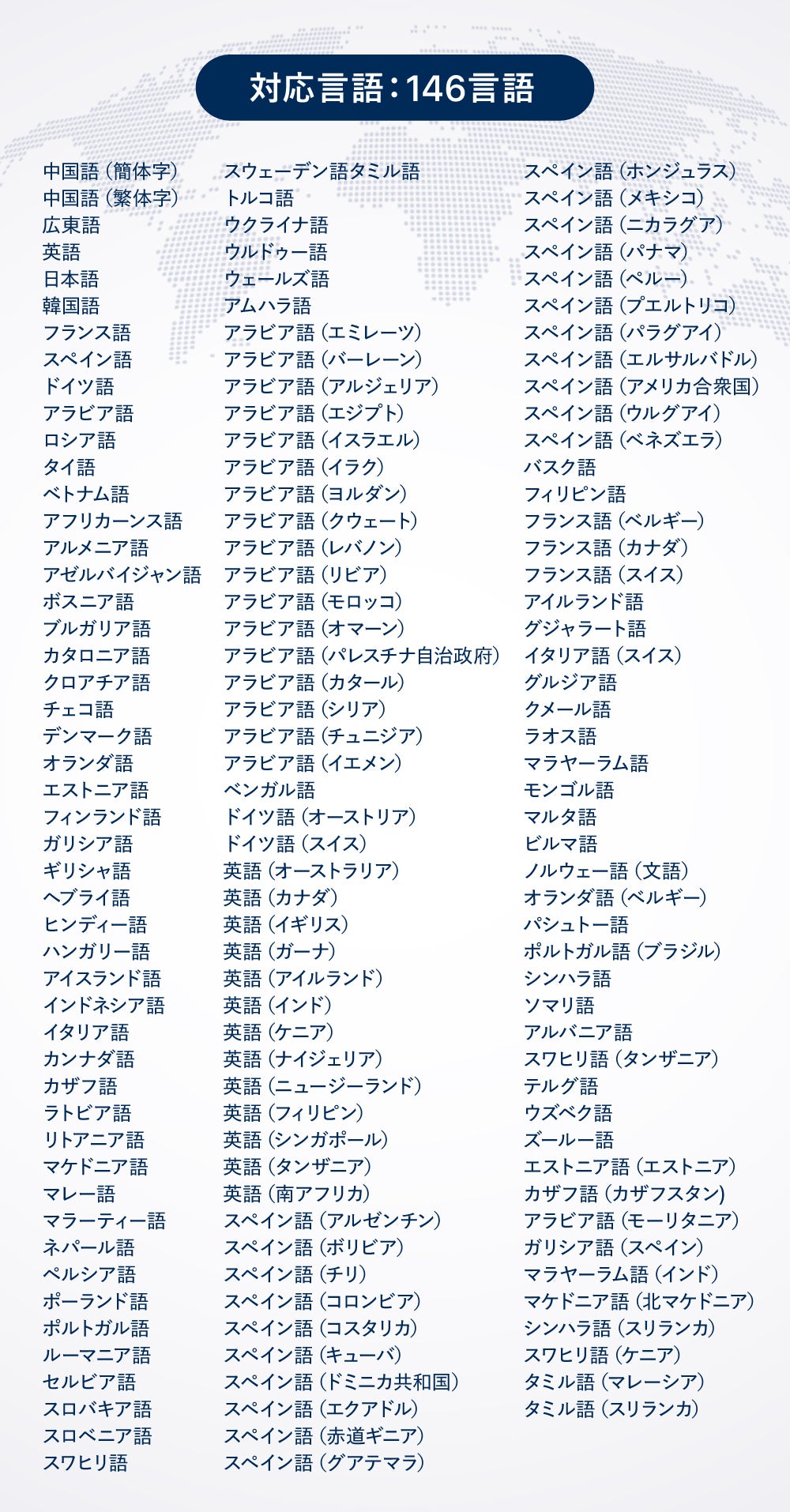 言語数は、リアルタイム翻訳と同じ146種類に対応しています。