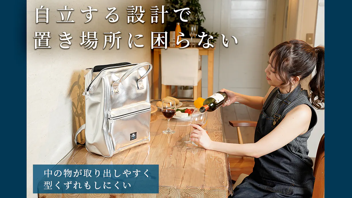 A. はい、バッグを開けた時、開口部が空いたままになりますので、タッパーなどのお弁当箱を重ねたり、750mlのワインボトルも縦にすっぽり収まります。