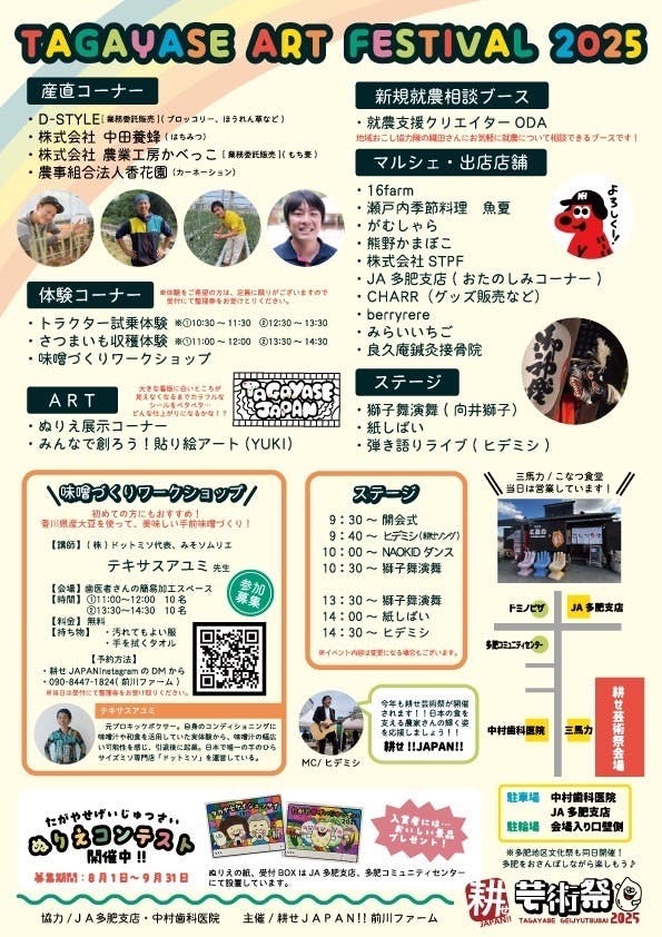 マルシェ&産直市も拡大!香川県内の「注目生産者様」が集結!そして「JA多肥支店様」地元アーティスト様の出店ご協力もいただきました。また今年より「高松市農産物ごじまん品推進協議会様」による特別ブースや新規就農相談ブースも登場!大人も子どもも楽しめる「芸術」「農業」のフェスティバル!そして、来年はさらなるパワーアップを目指します!