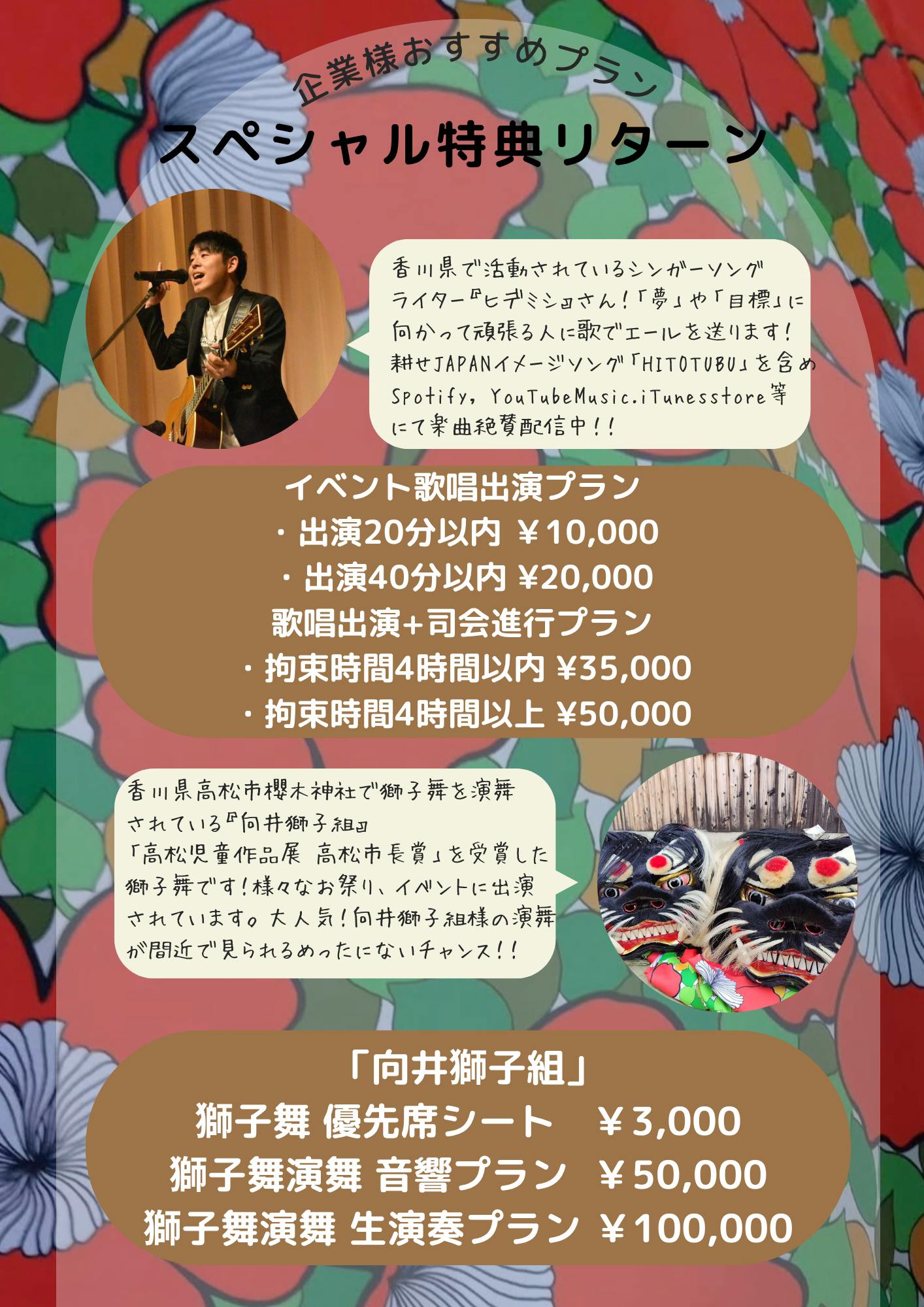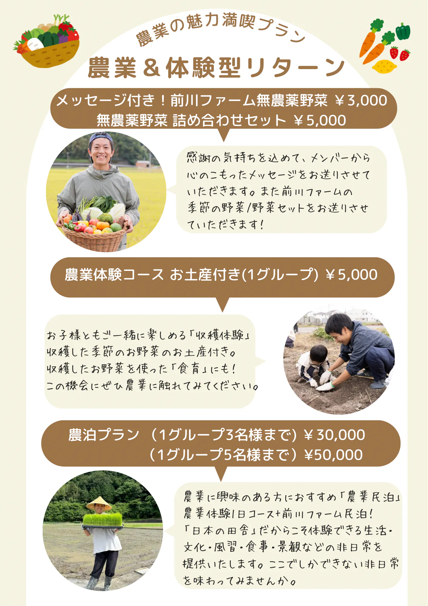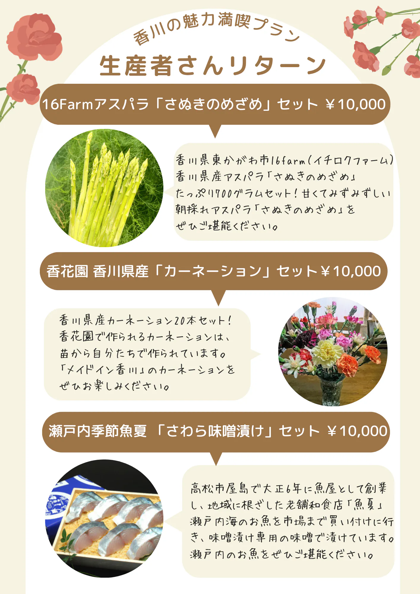 今回のクラウドファンディングでは、「香川県」や「農業」を盛り上げる為にいつもお世話になっている方々よりご協力いただき、様々な種類のリターンをご用意させていただきました!
