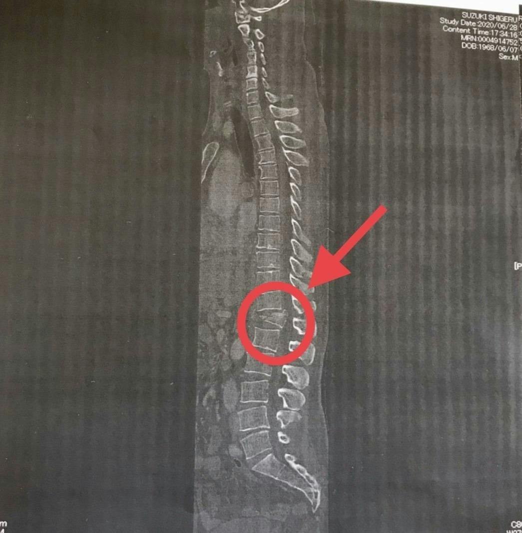 手術は無事終わり地獄のようなリハビリが開始され私生活にも支障が出るほどつらい毎日だった。実際のレントゲン写真が残っている。着地の衝撃で背骨が砕け押し出されているのがわかる。押し出された背骨が脊髄をさらに押し出し神経までも損傷した。