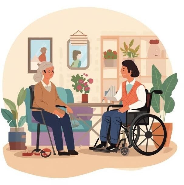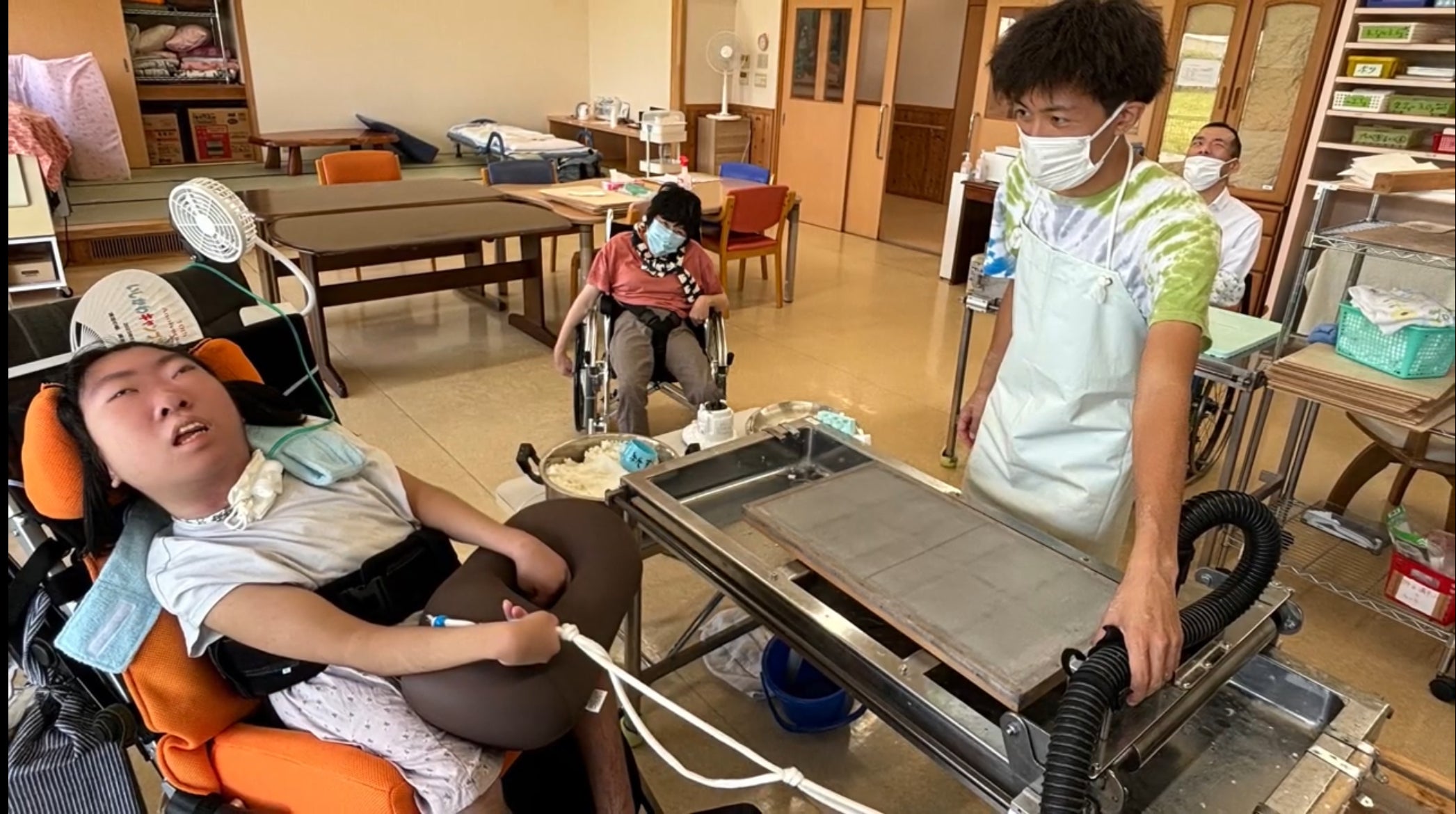 Mさんは~歳、身体障害があり、車いすを使っている。