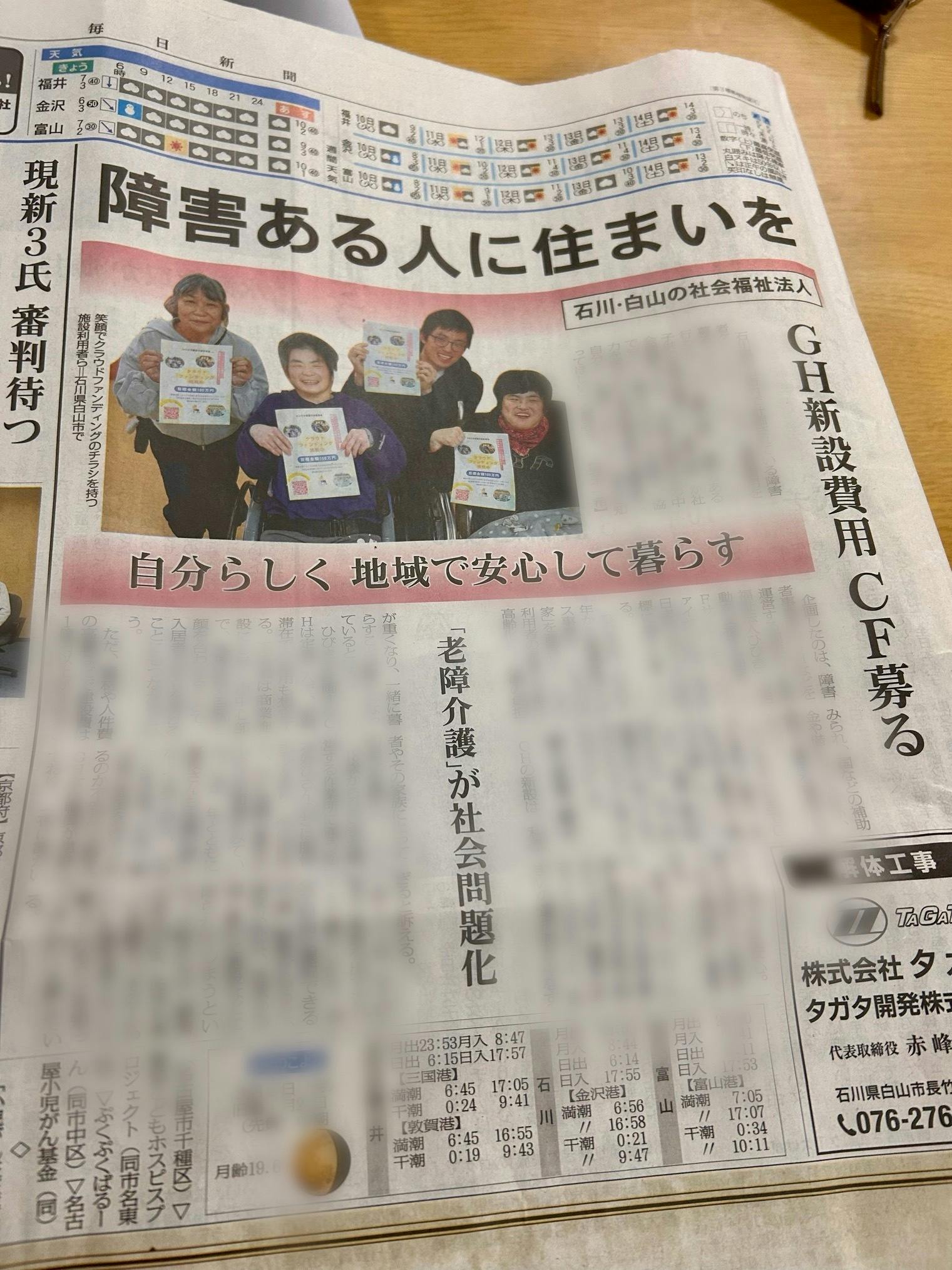 2026/03/08 22:10こんばんわ。今朝の毎日新聞の北陸の欄に大きくクラファンのことを載せていただきました!記事についてはこちら残り35日ほどになりました。障がいを持った人とその家族の声がこうした形で発信できてとてもうれしいです。障がいを持った人が自分らしく地域で安心して暮らすためにも引き続きご支援と拡散よろしくお願いします。最後まで広報活動頑張っていきます! もっと見る