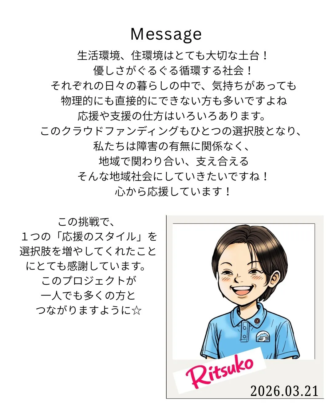 障害のある人とその家族の暮らしを支え、その人がその人らしい生活を送れるようにご支援ください。また、こちらのクラウドファンディングを家族や友達にぜひ広げてください。