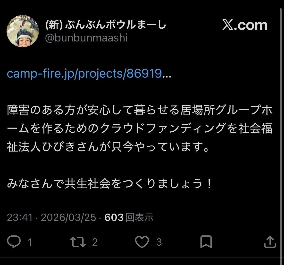 石川県住みます芸人の『ぶんぶんボウル』さんのXでひびきのクラファンを取り上げていただきました。
