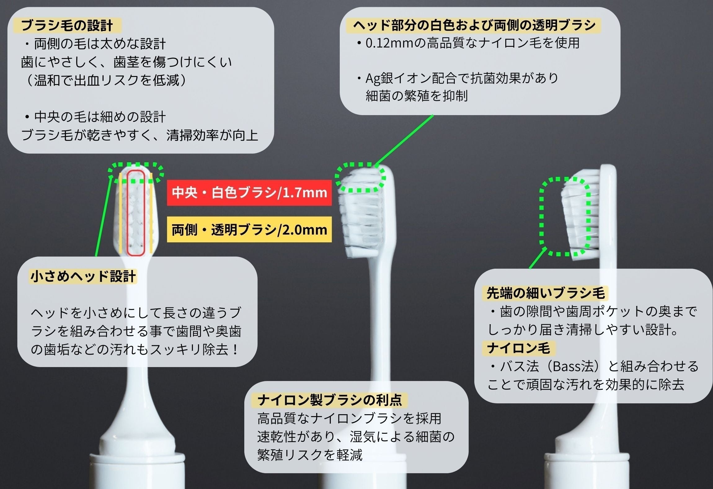 先端ブラシ:小型ヘッドを採用。奥歯までしっかり届き、口腔内で自在に動かすことが可能。