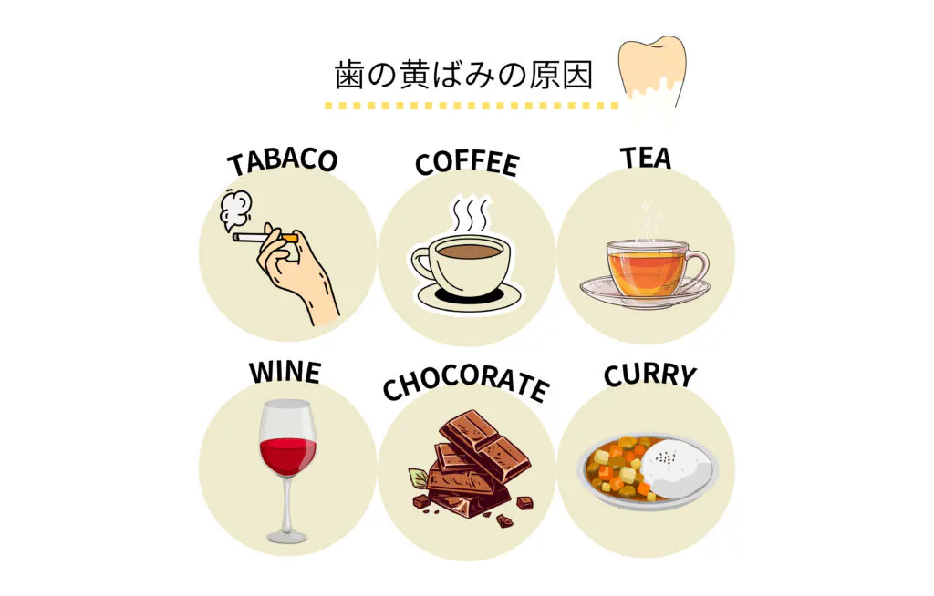 歯の着色汚れは「ステイン」とも呼ばれ、色の濃い食べ物に含まれるポリフェノールやタンニンが原因となります。これらの成分が歯の表面を覆うペリクルに付着することで、着色汚れが発生してしまうのです。