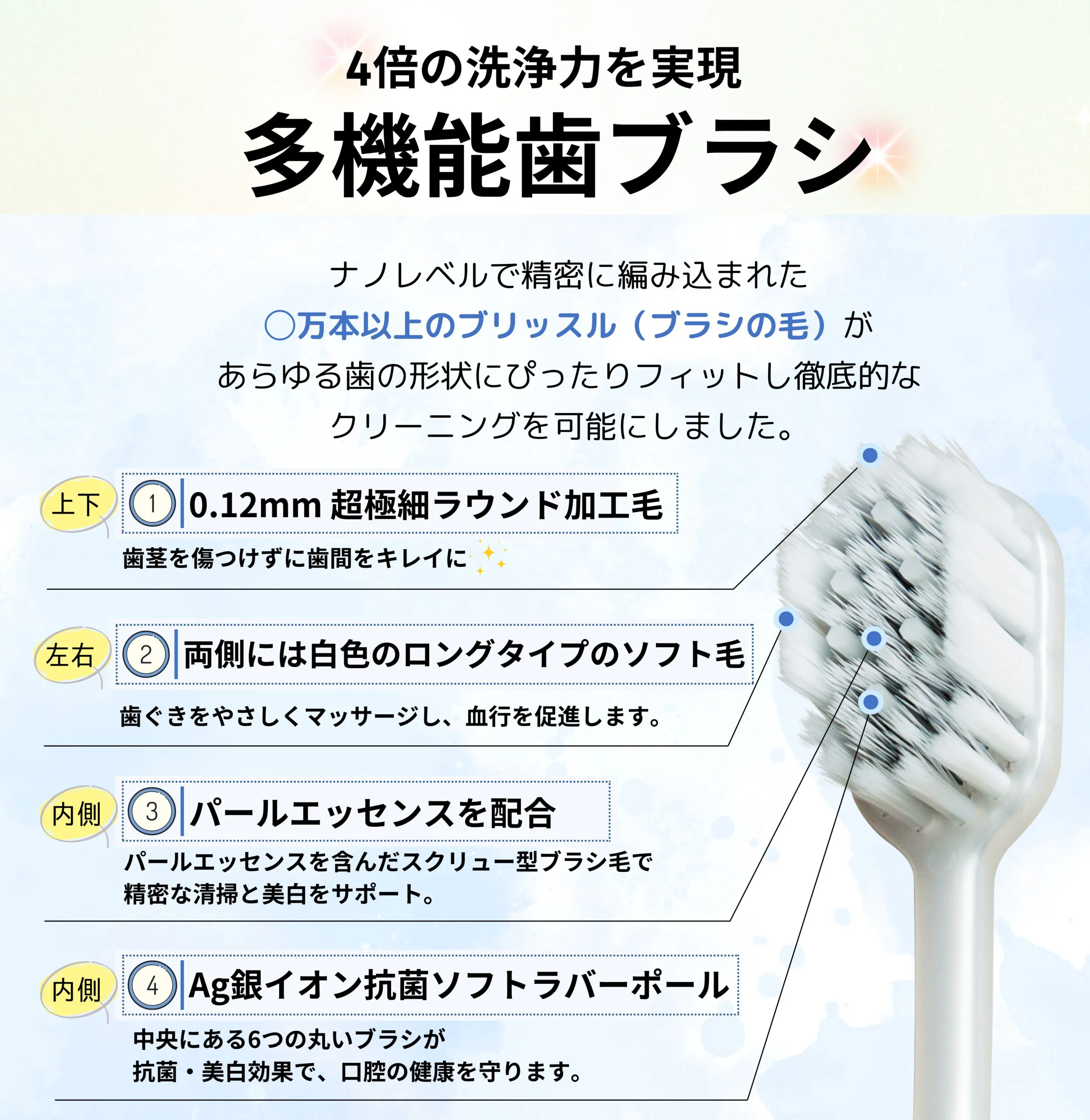 この歯ブラシは、特別な技術で開発され、ただ普通の歯磨きと置き換えるだけで歯を白くする効果を発揮します。