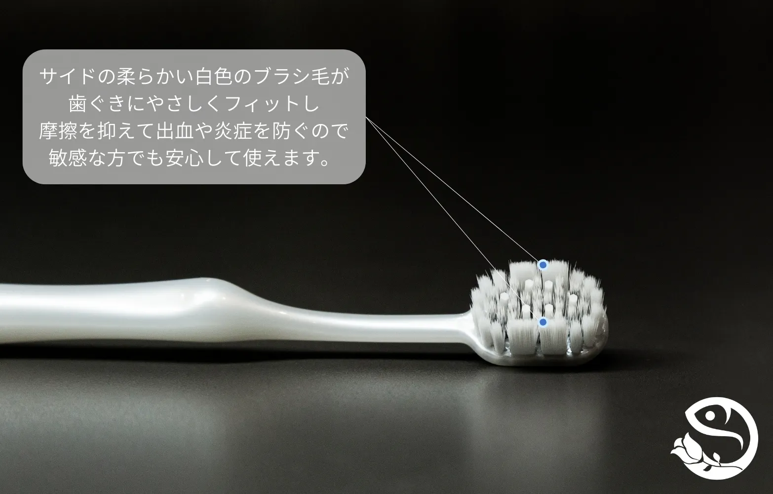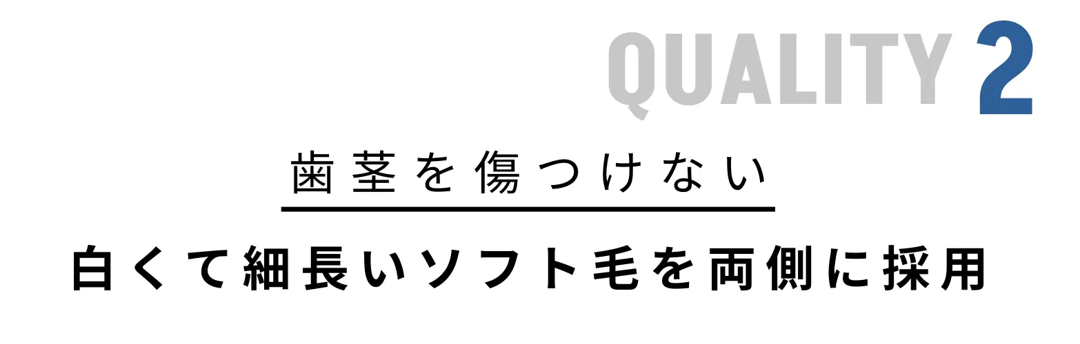口腔工学に基づいた設計で、両側に配置された白く柔らかく先端を丸めたブラシ毛が、歯のカーブや歯と歯ぐきの境目に自然にフィット。