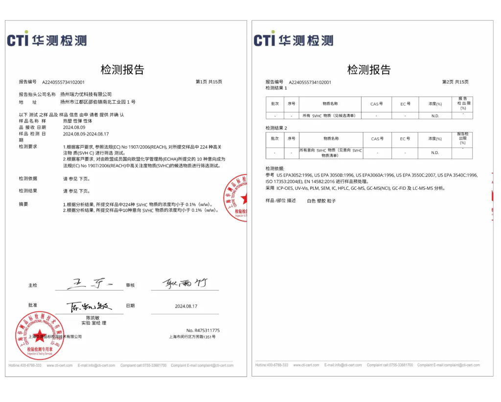 提出されたサンプルに含まれる224種類のSVHC物質の濃度は、すべて0.1%未満で基準を満たしています。また、10種類の候補SVHC物質の濃度も、すべて0.1%未満で基準に適合しています。