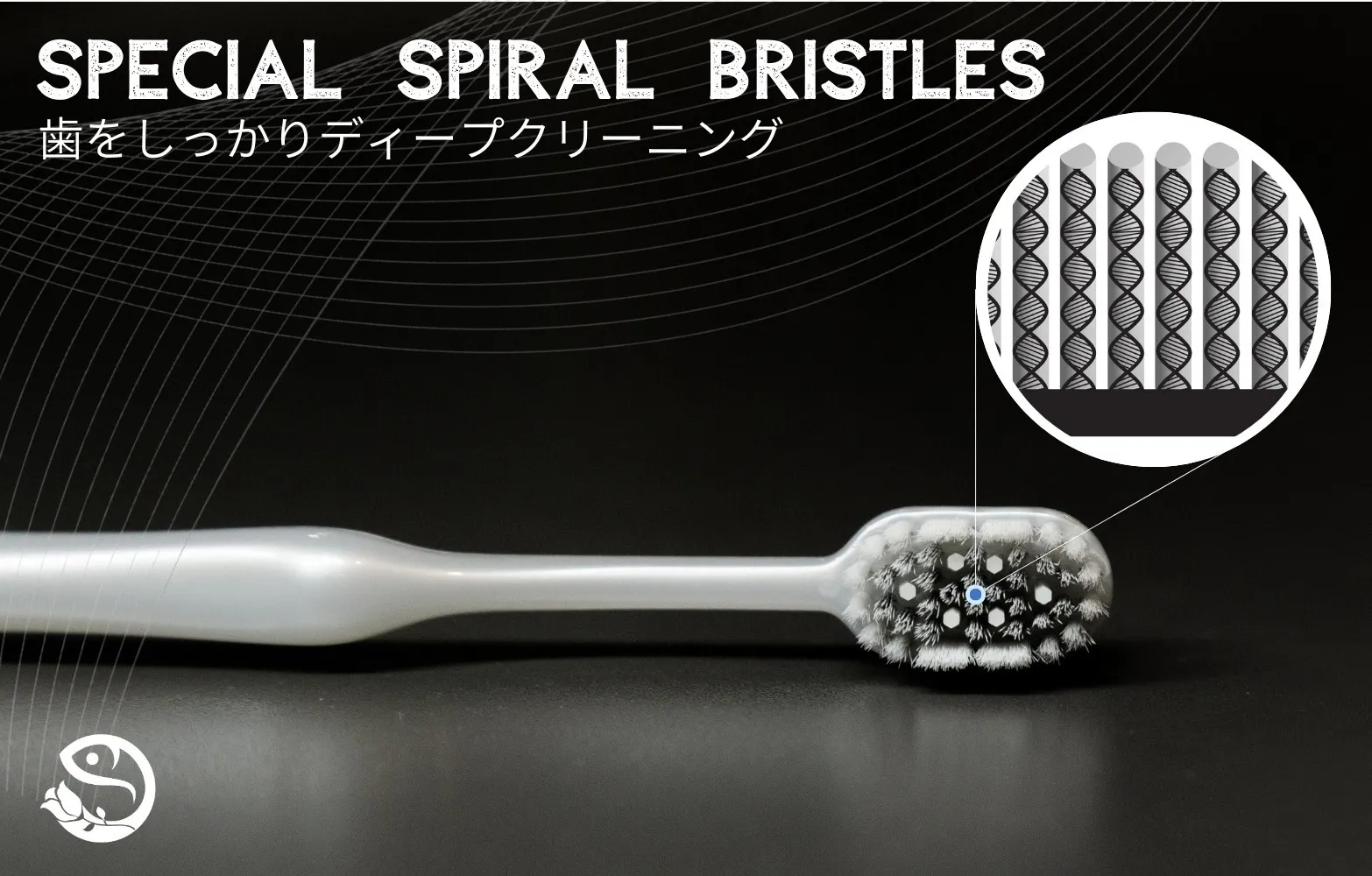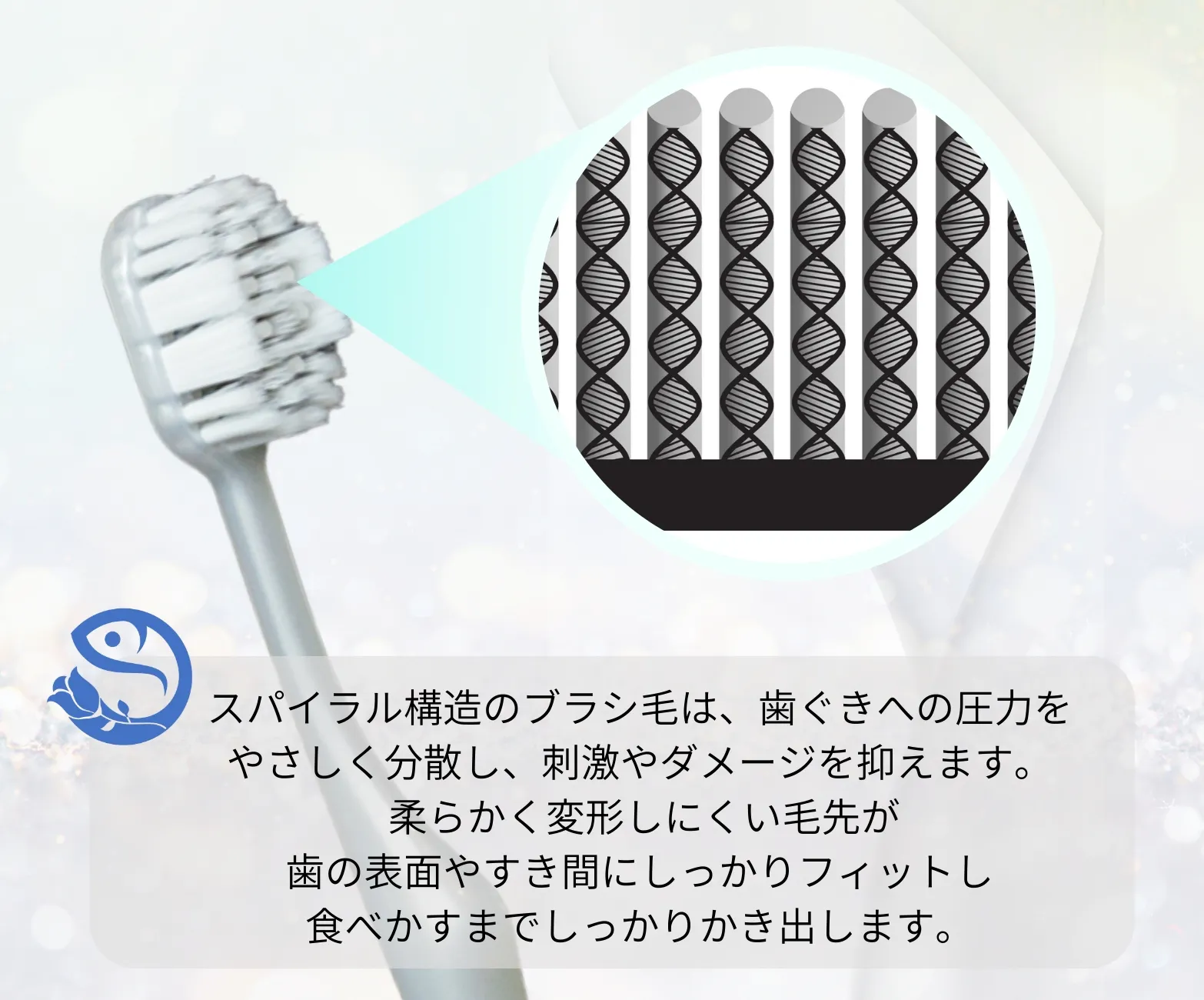 1本1本のスパイラル毛が、小さなドリルのように働き、歯ぐきをやさしく清掃・保護します。