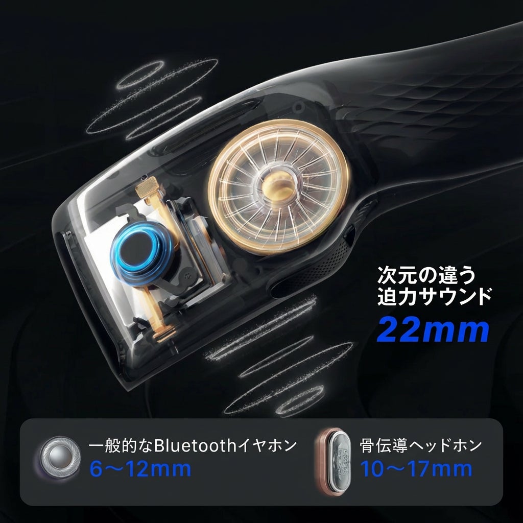 バンド形状だからこそ実現できた22mm特大ドライバーは、一般的なイヤホンや骨伝導モデルを大きく上回るサイズです。