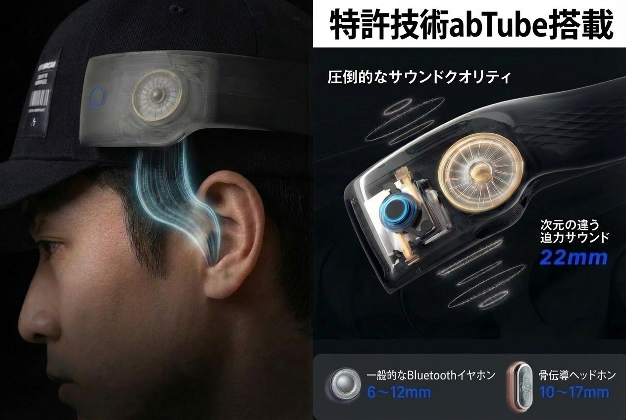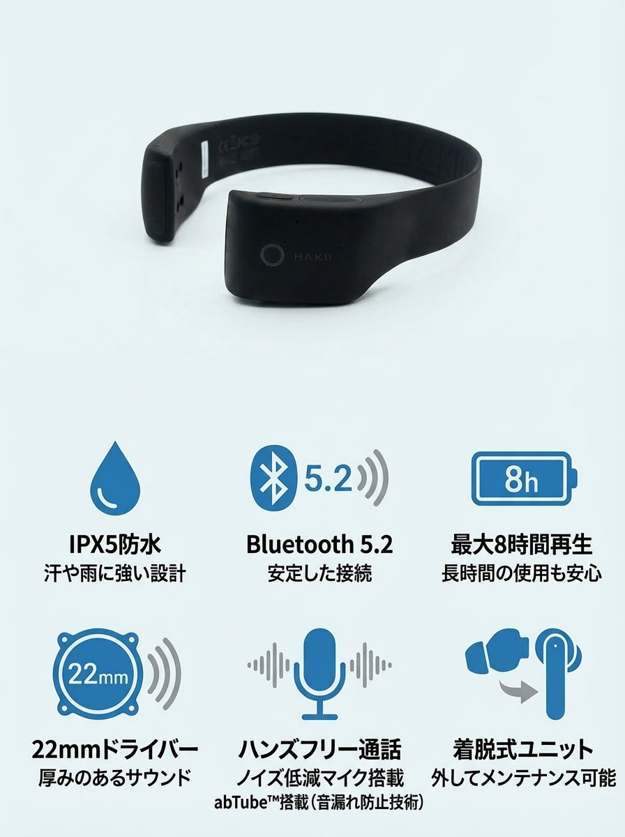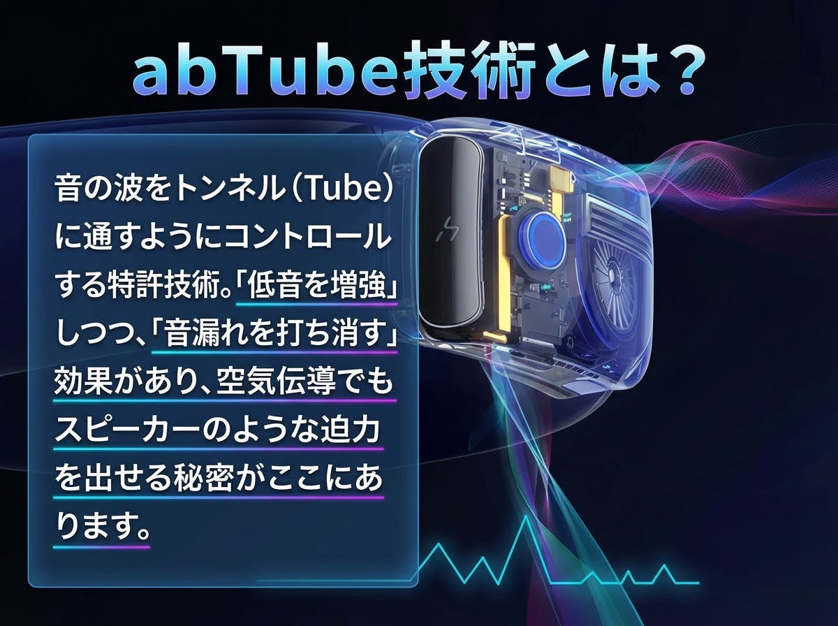 一般的なオープンイヤー型は音が拡散しがちですが、HAKIIは独自の音響構造「abTube」を採用しました。